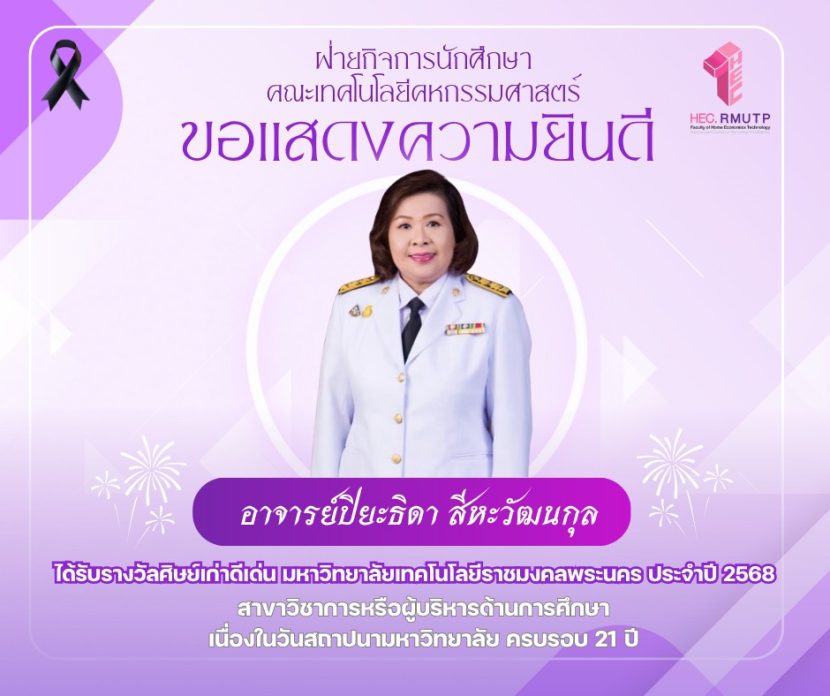 ขอแสดงความยินดีกับศิษย์เก่าคณะเทคโนโลยีคหกรรมศาสตร์ ที่ได้รับรางวัลเชิดชูเกียรติ “รางวัลศิษย์เก่าดีเด่น” ประจำปี 2568 จากมหาวิทยาลัยเทคโนโลยีราชมงคลพระนคร