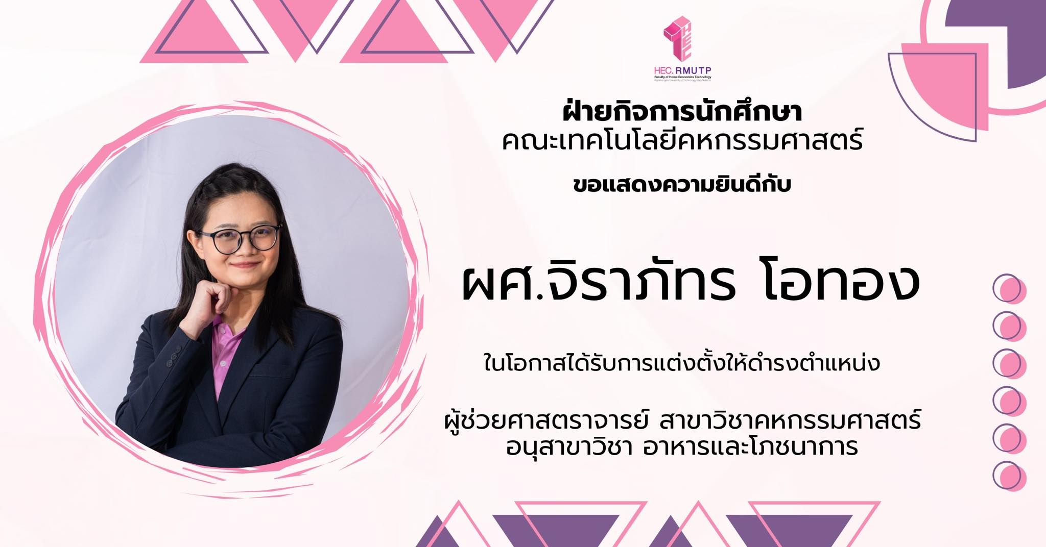 ประชาสัมพันธ์สำนักงานฝ่ายกิจการนักศึกษา ขอแสดงความยินดีกับ ผศ.จิราภัทร โอทอง Posted กันยายน 14, 2025 suphasit ฝ่ายกิจการนักศึกษา คณะเทคโนโลยีคหกรรมศาสตร์ ขอแสดงความยินดีกับ ผศ.จิราภัทร โอทอง ในโอกาสได้รับการแต่งตั้งให้ดำรงตำแหน่งผู้ช่วยศาสตราจารย์ สาขาวิชาคหกรรมศาสตร์ อนุสาขาวิชา อาหารและโภชนาการ
