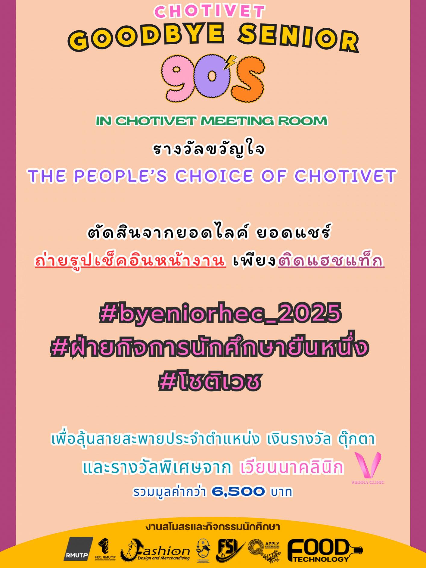 กิจกรรม / โครงการงานสโมสรและกิจกรรมนักศึกษาประชาสัมพันธ์ เตรียมตัวให้พร้อม! กับงาน CHOTIVET GOODBYE SENIOR Posted ตุลาคม 14, 2025 suphasit เตรียมตัวให้พร้อม! กับงาน CHOTIVET GOODBYE SENIOR ธีม 90’s Night สุดชิค ที่จะพาทุกคนย้อนเวลาไปกับความทรงจำแสนอบอุ่น พร้อมกิจกรรมสุดพิเศษมากมาย วันงาน: 7 ตุลาคม 2568 สถานที่: CHOTIVET MEETING ROOM เริ่มลงทะเบียน: 17.00 น. ที่ ชั้น 1 ลานอเนกประสงค์ อาคารเรือนปัญญา อย่าลืมถ่ายรูป เช็กอิน โพสต์แท็กให้สุด โพสต์รูปติดแท็ก เพื่อเข้าร่วมการประกวด The People’s Choice of CHOTIVET แล้วมาร่วมเป็นส่วนหนึ่งของความทรงจำครั้งสำคัญนี้ด้วยกันนะ