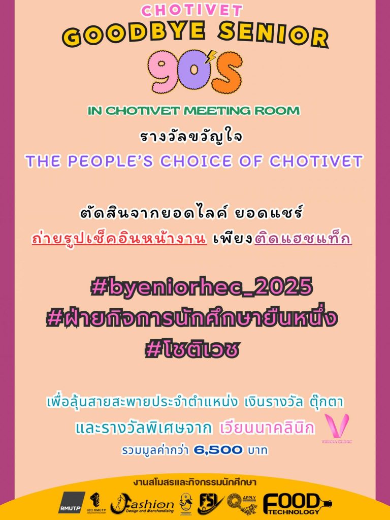 กิจกรรม / โครงการงานสโมสรและกิจกรรมนักศึกษาประชาสัมพันธ์ CHOTIVET GOODBYE SENIOR Posted ตุลาคม 14, 2025 suphasit CHOTIVET GOODBYE SENIOR การประกวด The People’s Choice of CHOTIVET แจกสายสะพาย เงินรางวัล ตุ๊กตา และรางวัลพิเศษจากเวียนนาคลินิก รวมมูลค่ากว่า บาท เพียงถ่ายรูป เช็กอิน โพสต์แท็กให้สุด เพียงโพสต์รูปติดแฮชแท็ก #byeniorhec_2025 #ฝ่ายกิจการนักศึกษายืนหนึ่ง #โชติเวช วันงาน: 7 ตุลาคม 2568 สถานที่: CHOTIVET MEETING ROOM เริ่มลงทะเบียน: 17.00 น. ที่ ชั้น 1 ลานอเนกประสงค์ อาคารเรือนปัญญา ธีม ยุค 90‘s