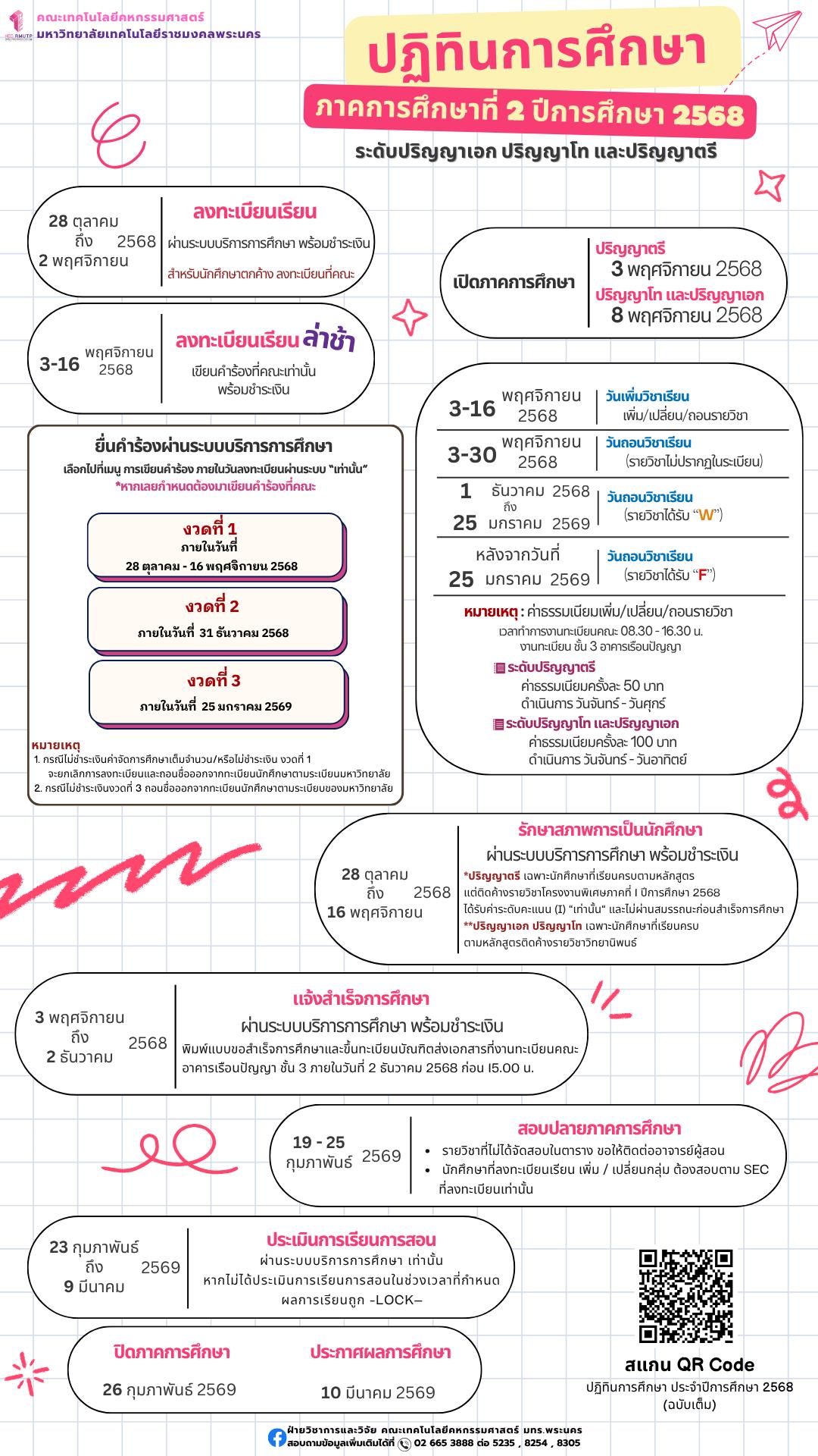 ประชาสัมพันธ์สำนักงานฝ่ายกิจการนักศึกษา ปฏิทินการศึกษา ภาคการศึกษาที่ 2 ปีการศึกษา 2568 Posted ตุลาคม 24, 2025 suphasit ปฏิทินการศึกษา ภาคการศึกษาที่ 2 ปีการศึกษา 2568 ลงทะเบียนเรียน ผ่านระบบบริการการศึกษา พร้อมชำระเงิน 28 ตุลาคม ถึง 2 พฤศจิกายน 2568 https://reg.rmutp.ac.th/registrar/home.asp ยื่นคำร้องผ่านระบบบริการการศึกษา เลือกไปที่เมนู การเขียนคำร้อง ภายในวันลงทะเบียนผ่านระบบ “เท่านั้น” *หากเลยกำหนดต้องมาเขียนคำร้องที่คณะ เปิดภาคการศึกษา ระดับปริญญาตรี 3 พฤศจิกายน 2568
