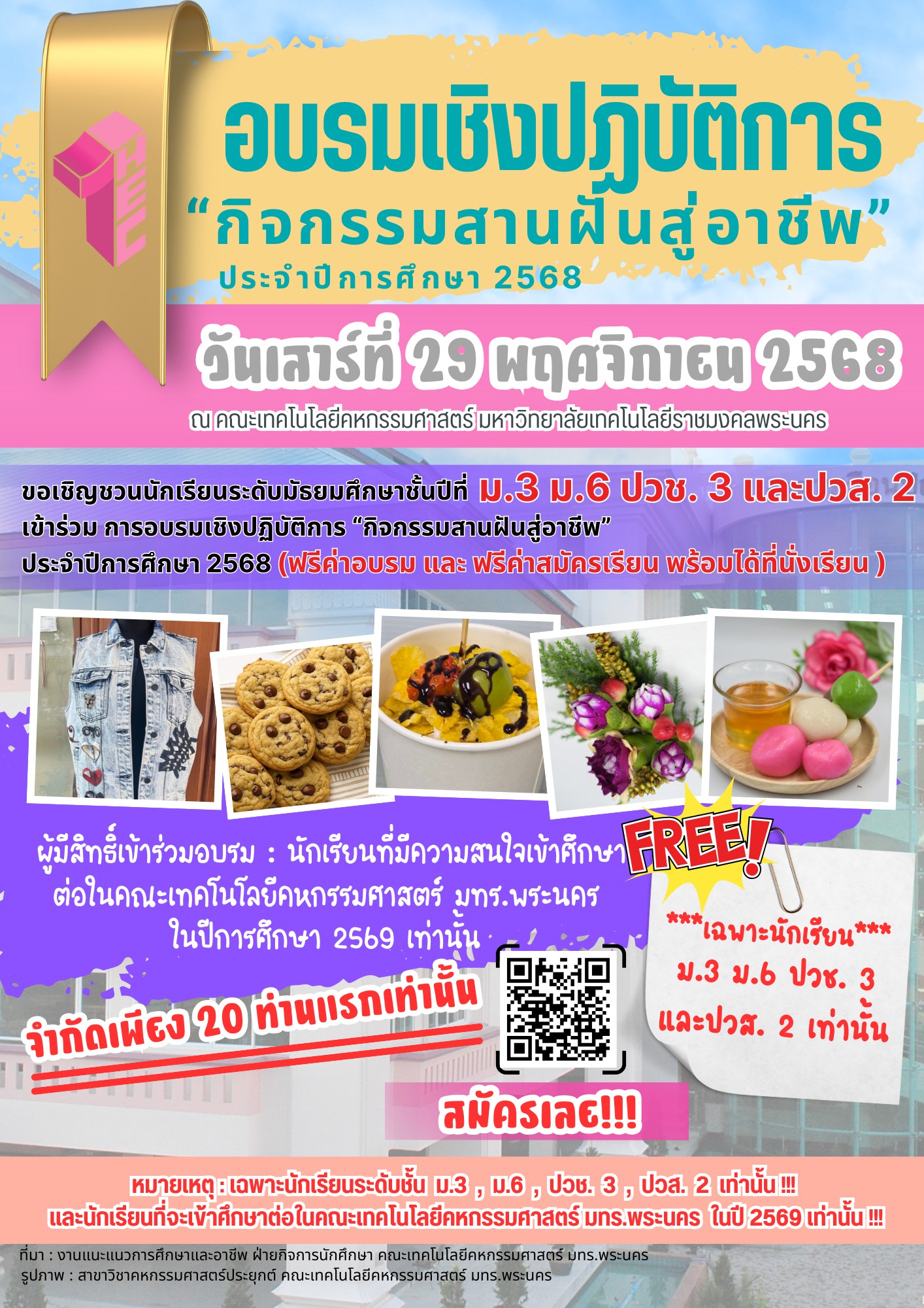หมายเหตุ : เฉพาะนักเรียนระดับชั้น ม.3 , ม.6 , ปวช. 3 , ปวส. 2 เท่านั้น และนักเรียนที่จะเข้าศึกษาต่อในคณะเทคโนโลยีคหกรรมศาสตร์ มทร.พระนคร ในปีการศึกษา 2569 เท่านั้น