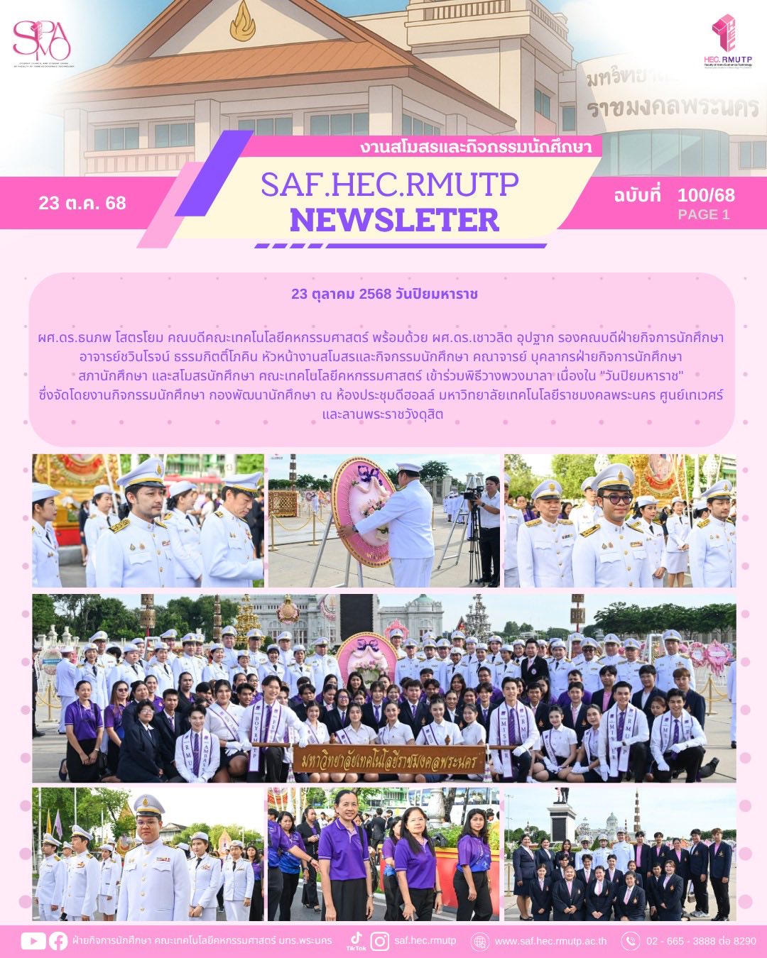 ผศ.ดร.ธนภพ โสตรโยม คณบดีคณะเทคโนโลยีคหกรรมศาสตร์ พร้อมด้วย ผศ.ดร.เชาวลิต อุปฐาก รองคณบดีฝ่ายกิจการนักศึกษา อาจารย์ชวินโรจน์ ธรรมกิตติ์โภคิน หัวหน้างานสโมสรและกิจกรรมนักศึกษา คณาจารย์ บุคลากรฝ่ายกิจการนักศึกษา สภานักศึกษา และสโมสรนักศึกษา คณะเทคโนโลยีคหกรรมศาสตร์ เข้าร่วมพิธีวางพวงมาลา เนื่องใน “วันปิยมหาราช” ซึ่งจัดโดยงานกิจกรรมนักศึกษา กองพัฒนานักศึกษา ณ ห้องประชุมดีฮอลล์ มหาวิทยาลัยเทคโนโลยีราชมงคลพระนคร ศูนย์เทเวศร์ และลานพระราชวังดุสิต