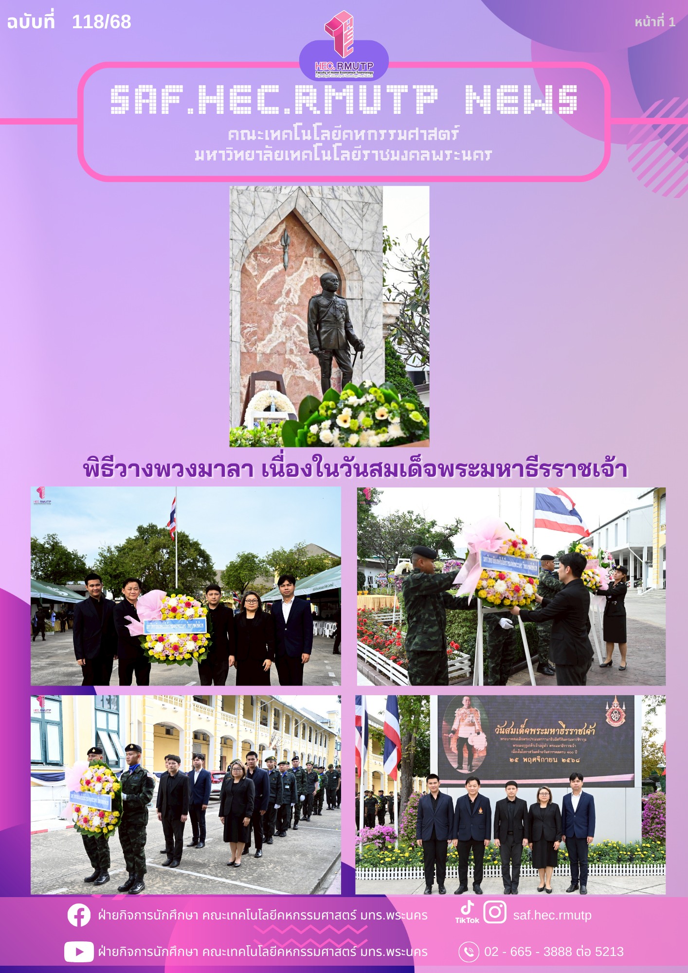 ในการนี้ ผู้ช่วยศาสตราจารย์ ดร. ธนภพ โสตรโยม คณบดีคณะเทคโนโลยีคหกรรมศาสตร์ เป็นผู้แทนคณะฯ ในพิธีวางพวงมาลา ถวายราชสดุดี พร้อมด้วยอาจารย์นพพร สกุลยืนยงสุข รองคณบดีฝ่ายวางแผน นางสาวรติมากานต์ ห้วยหงษ์ทอง รักษาราชการแทนหัวหน้าสำนักงานคณบดี โดยผู้ช่วยศาสตราจารย์ ดร.เชาวลิต อุปฐาก ได้มอบหมายให้ นายสิรดนัย กลิ่นมาลัย หัวหน้างานวิชาทหาร และนายธีรรัตน์ สัมพันธวงค์ นักวิชาการศึกษา ปฎิบัติหน้าที่ในนำทีมผู้บริหารในการเข้าร่วมพิธีวางพวงมาลาในครั้งนี้ เมื่อวันที่ 25 พฤศจิกายน 2568 ณ พระบรมราชานุสาวรีย์พระบาทสมเด็จพระมงกุฎเกล้าเจ้าอยู่หัว ภายในหน่วยบัญชาการรักษาดินแดน