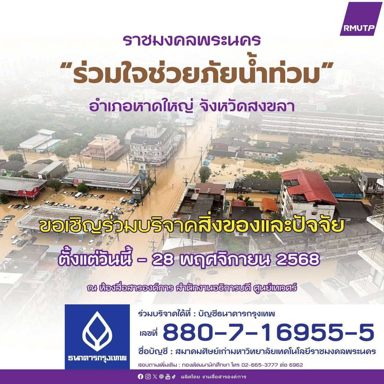 มหาวิทยาลัยเทคโนโลยีราชมงคลพระนคร ร่วมกับสมาคมศิษย์เก่ามหาวิทยาลัยเทคโนโลยีราชมงคลพระนคร เปิดจุดรับบริจาคสิ่งของอุปโภคบริโภค ณ ห้องสื่อสารองค์การ สำนักงานอธิการบดี (ศูนย์เทเวศร์) หรือบริจาคเงินช่วยเหลือผ่านบัญชี เลขที่ 880-7-16955-5 ชื่อบัญชี สมาคมศิษย์เก่ามหาวิทยาลัยเทคโนโลยีราชมงคลพระนคร ธนาคารกรุงเทพ ตั้งแต่วันนี้-28 พฤศจิกายน 2568
