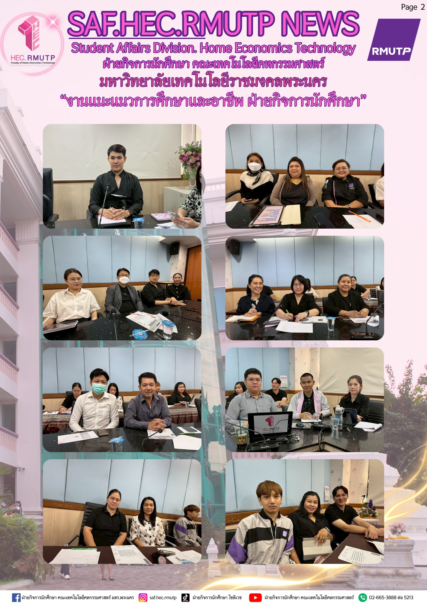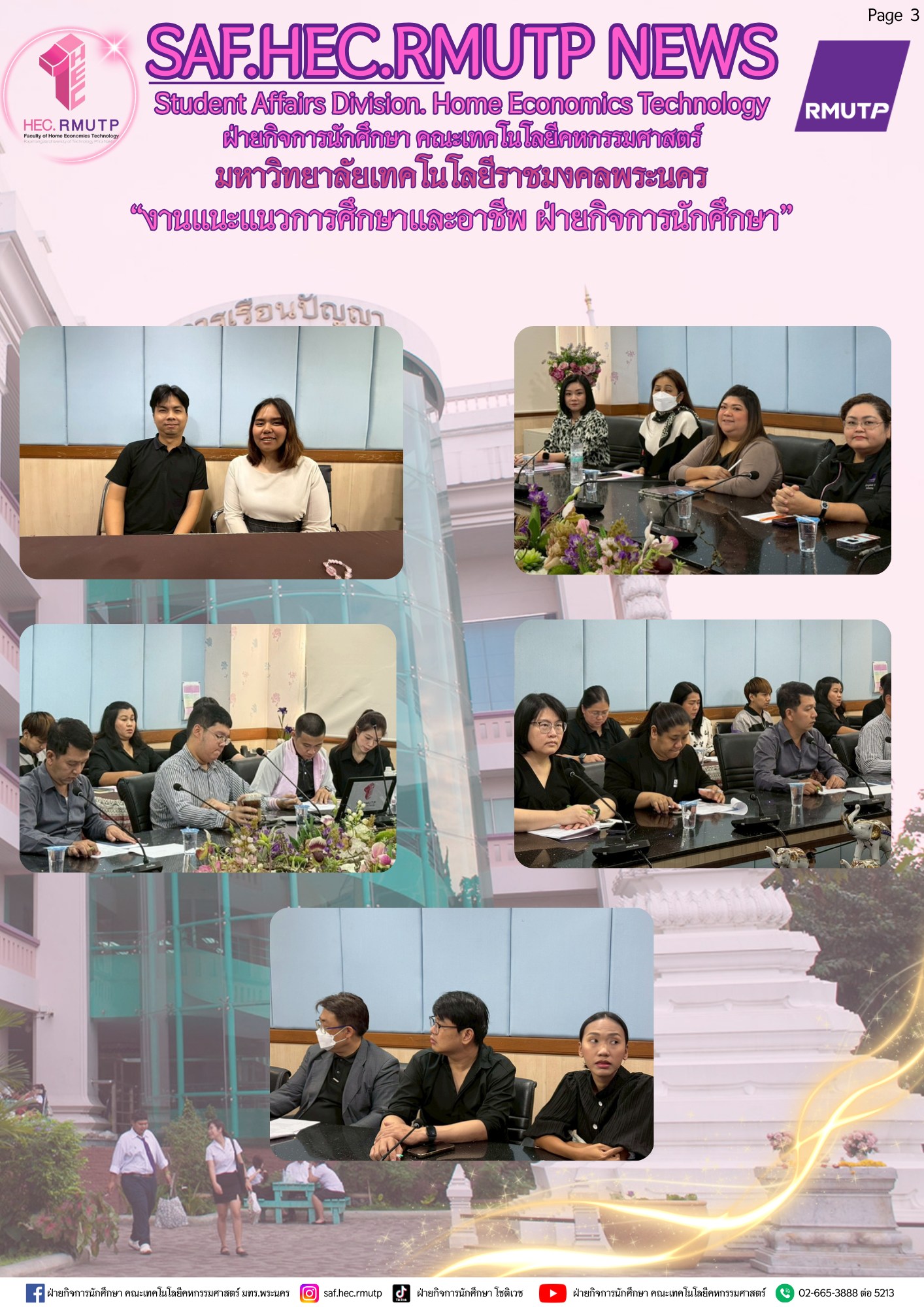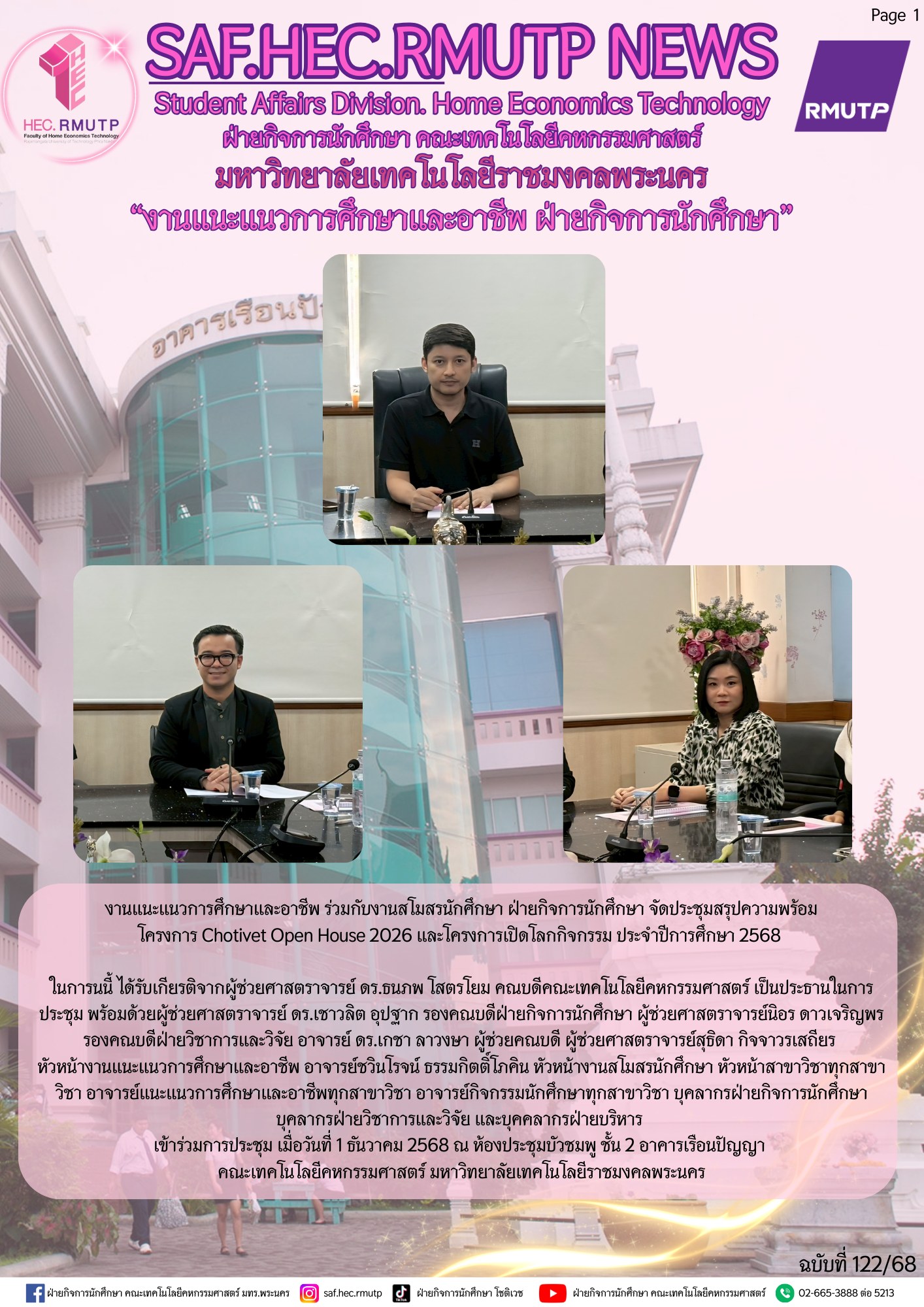 ในการนนี้ ได้รับเกียรติจากผู้ช่วยศาสตราจารย์ ดร.ธนภพ โสตรโยม คณบดีคณะเทคโนโลยีคหกรรมศาสตร์ เป็นประธานในการประชุม พร้อมด้วยผู้ช่วยศาสตราจารย์ ดร.เชาวลิต อุปฐาก รองคณบดีฝ่ายกิจการนักศึกษา ผู้ช่วยศาสตราจารย์นิอร ดาวเจริญพร รองคณบดีฝ่ายวิชาการและวิจัย อาจารย์ ดร.เกชา ลาวงษา ผู้ช่วยคณบดี ผู้ช่วยศาสตราจารย์สุธิดา กิจจาวรเสถียร