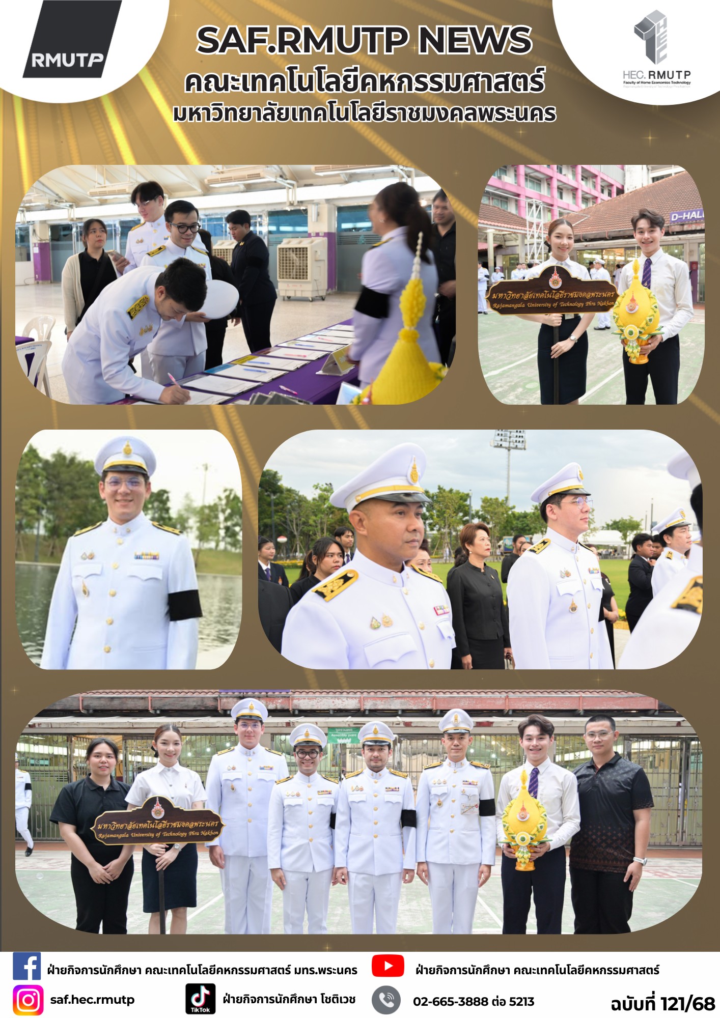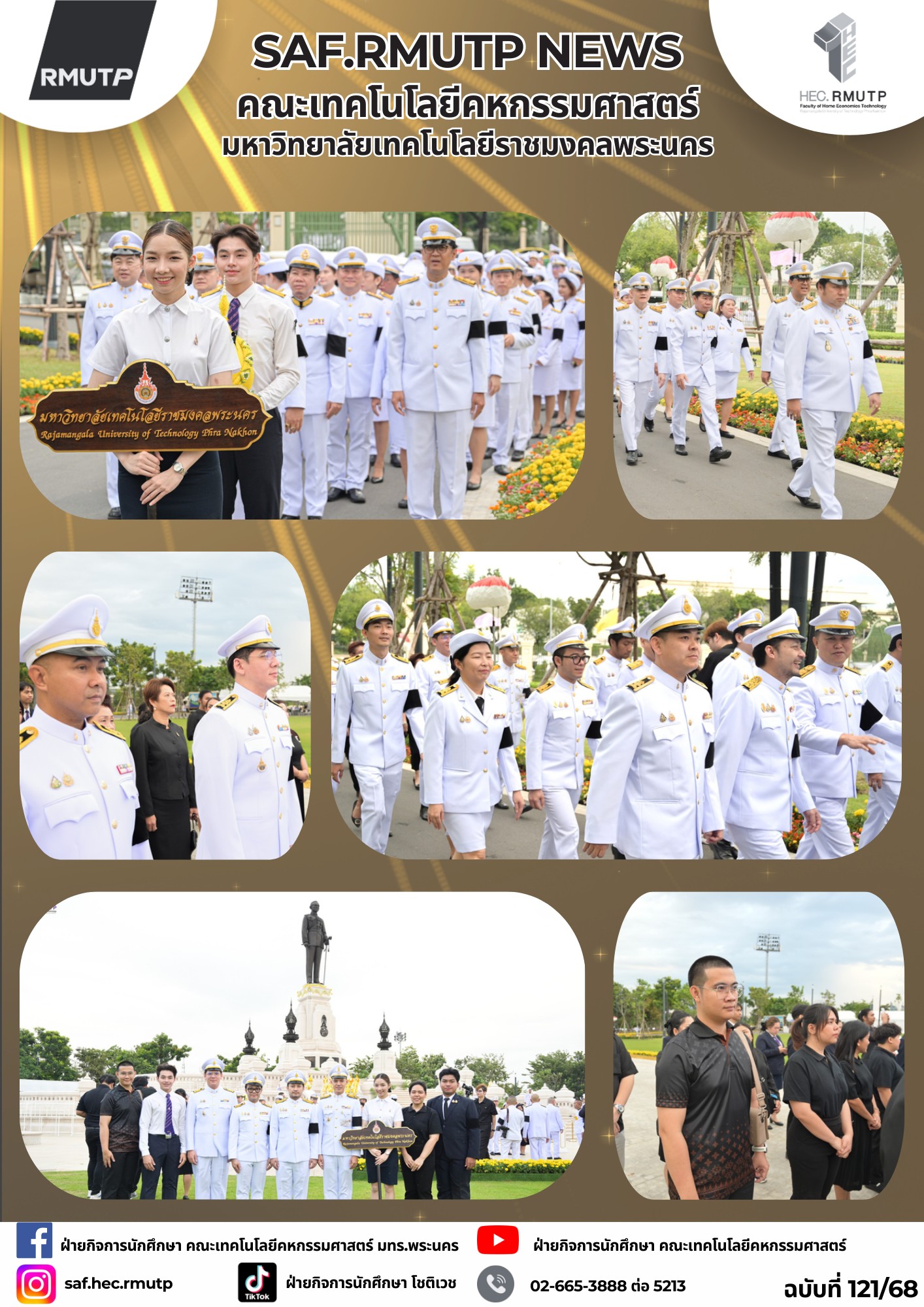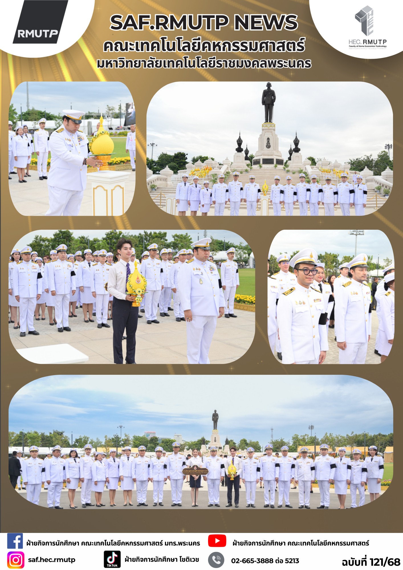 ท่านผู้ช่วยศาสตราจารย์ ดร.ธนภพ โสตรโยม คณบดีคณะเทคโนโลยีคหกรรมศาสตร์ มทร.พระนคร พร้อมด้วย ผู้ช่วยศาสตราจารย์ ดร.เชาวลิต อุปฐาก รองคณบดีฝ่ายกิจการนักศึกษา อาจารย์ศุภสิทธ์ วราศิลป์ หัวหน้างานศิลปวัฒนธรรม และบุคลากร เข้าร่วมกิจกรรม พิธีวางพุ่มดอกไม้ถวายราชสักการะพระบรมราชานุสาวรีย์ เมื่อวันที่ 5 ธันวาคม 2568 ณ อุทยานเฉลิมพระเกียรติ (901 แลนด์)