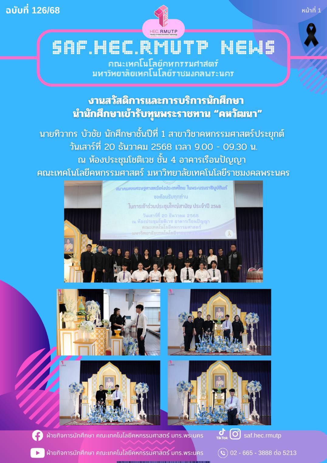 ประธานในพิธีการประชุมใหญ่สามัญประจำปี พ.ศ.2568 ของสมาคมคหเศรษฐศาสตร์แห่งประเทศไทยในพระบรมราชินูปถัมภ์ ในวันเสาร์ที่ 20 ธันวาคม 2568 ณ ห้องประชุมโชติเวช ชั้น 4 อาคารเรือนปัญญา คณะเทคโนโลยีคหกรรมศาสตร์ มหาวิทยาลัยเทคโนโลยีราชมงคลพระนคร ทั้งนี้ในการประชุมดังกล่าว ได้จัดพิธีมอบทุนพระราชทาน “คหวัฒนา” แก่นักศึกษาที่มีผลการเรียนดี มีความประพฤติดี แต่ขาดแคลนทุนทรัพย์ โดยนักศึกษาคณะเทคโนโลยีคหกรรมศาสตร์ มทร.พระนคร นายทิวากร บัวชัย นักศึกษาชั้นปึที่ 1 สาขาวิชาคหกรรมศาสตร์ประยุกต์ ได้รับการคัดเลือกเข้ารับทุนพระราชทาน“คหวัฒนา”ประจำปี 2568