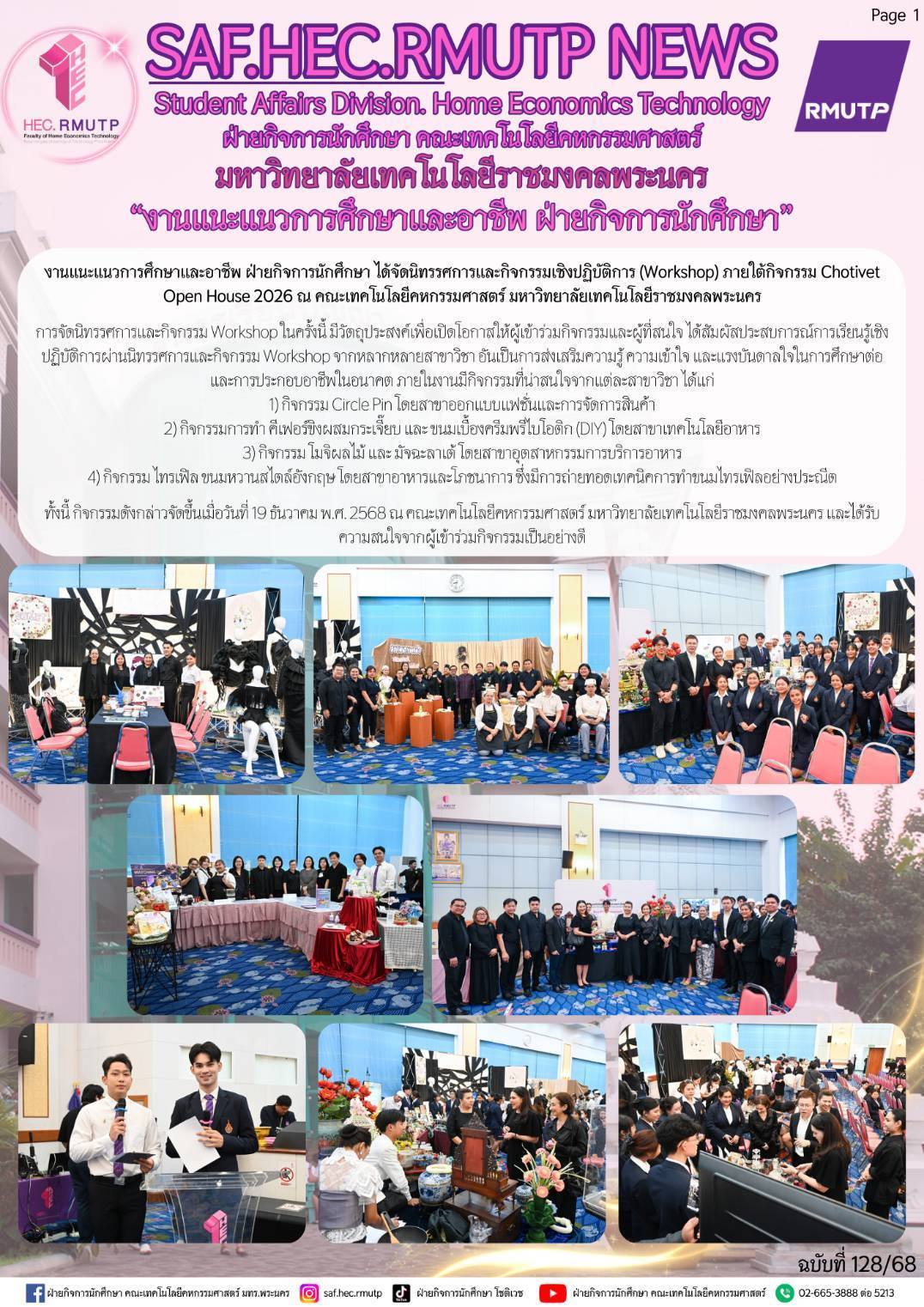 ทั้งนี้ กิจกรรมดังกล่าวจัดขึ้นเมื่อวันที่ 19 ธันวาคม พ.ศ. 2568 ณ คณะเทคโนโลยีคหกรรมศาสตร์ มหาวิทยาลัยเทคโนโลยีราชมงคลพระนคร และได้รับความสนใจจากผู้เข้าร่วมกิจกรรมเป็นอย่างดี