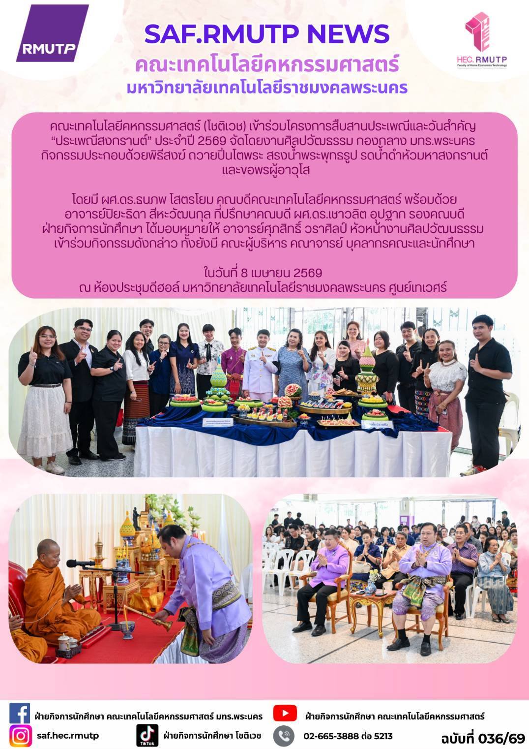 “ประเพณีสงกรานต์” ประจำปี 2569 จัดโดยงานศิลปวัฒธรรม กองกลาง มทร.พระนคร กิจกรรมประกอบด้วยพิธีสงฆ์ ถวายปิ่นโตพระ สรงน้ำพระพุทธรูป รดน้ำดำหัวมหาสงกรานต์ และขอพรผู้อาวุโส