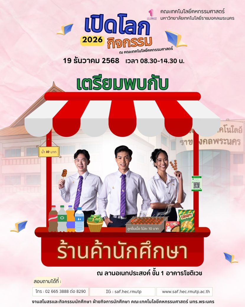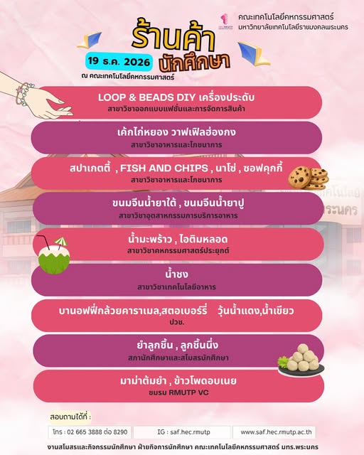 เปิดโลกกิจกรรม คณะเทคโนโลยีคหกรรมศาสตร์ 2026 วันศุกร์ที่ 19 ธันวาคม 2568 เวลา 08.30 – 14.30 น.