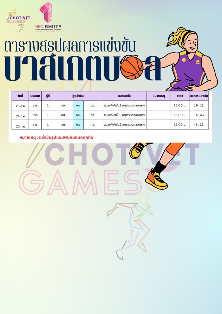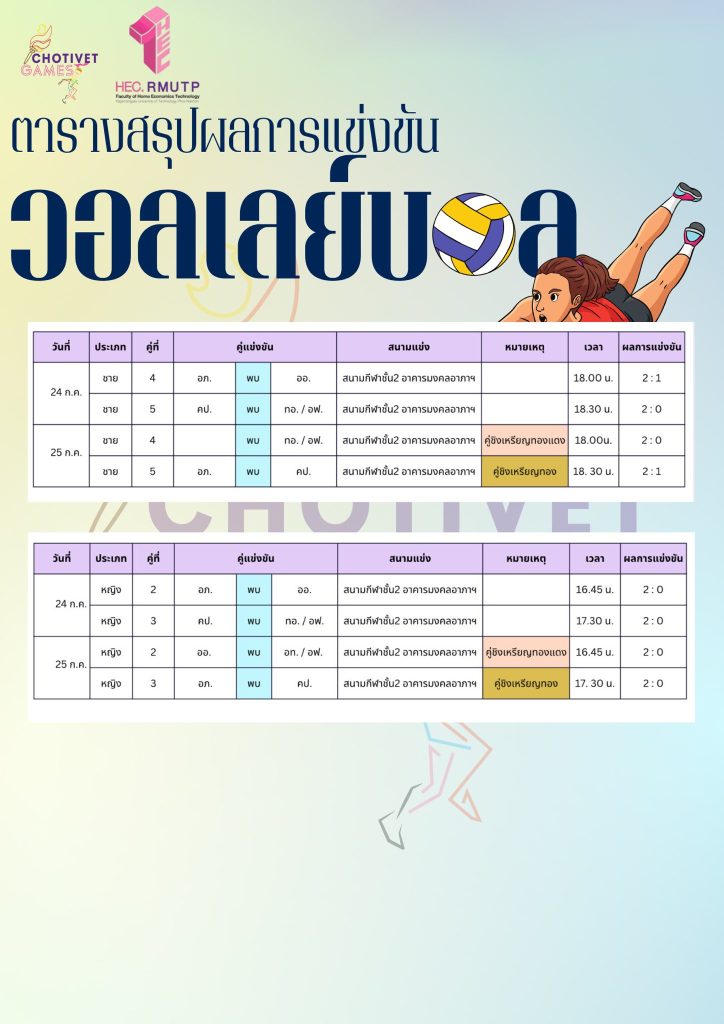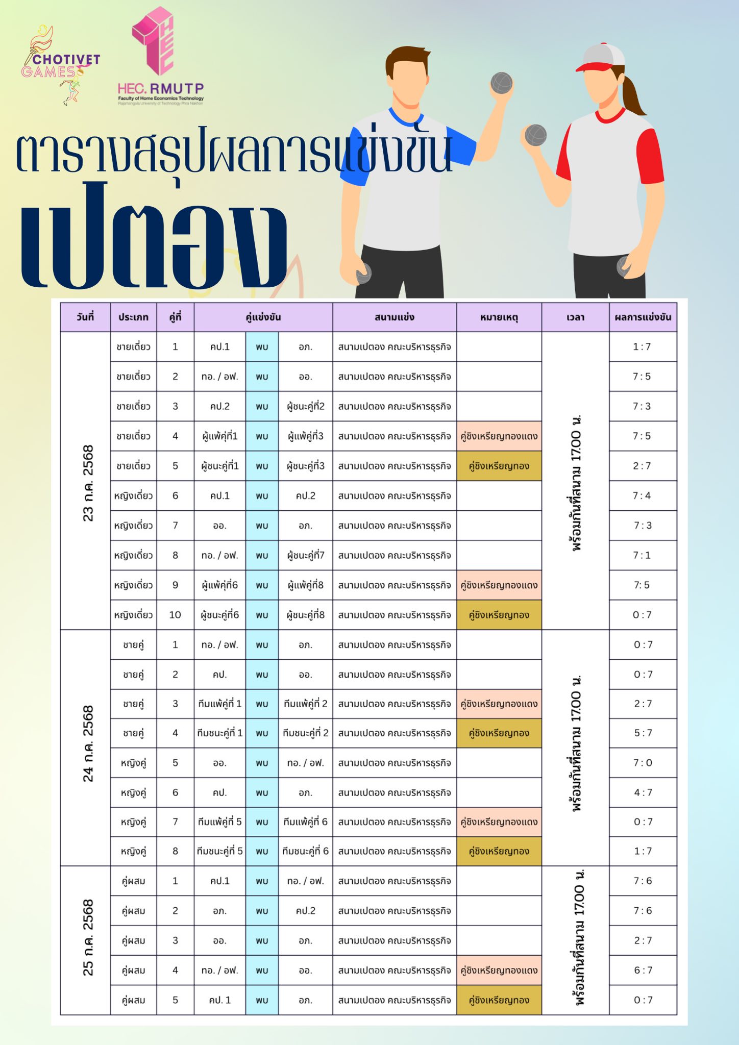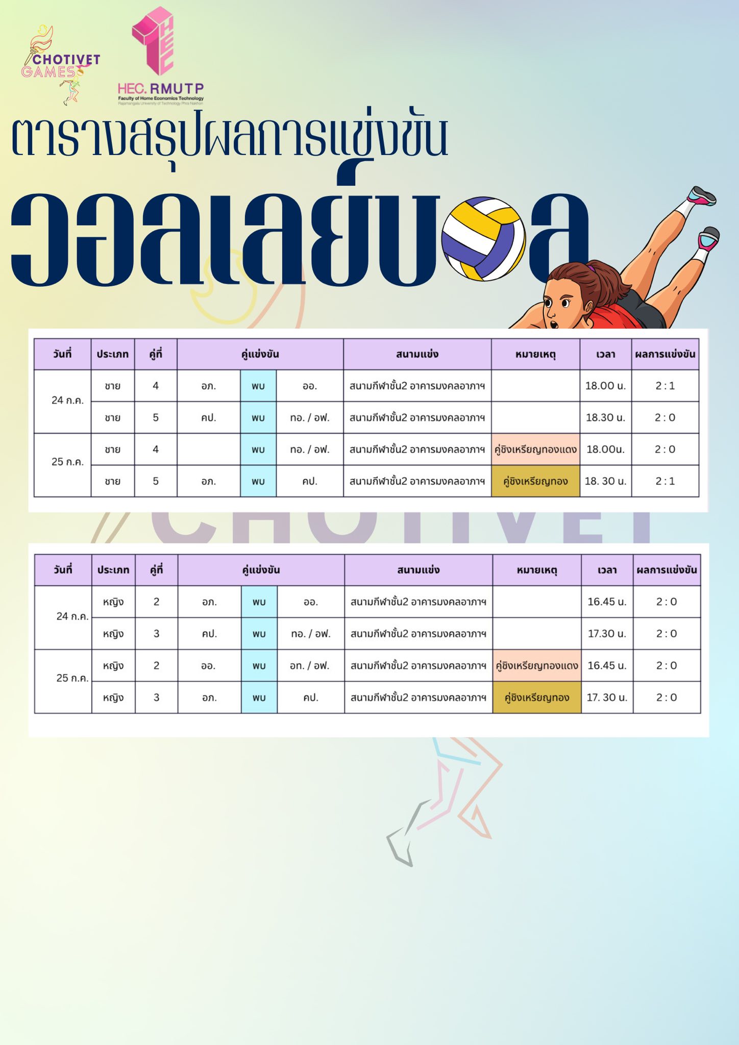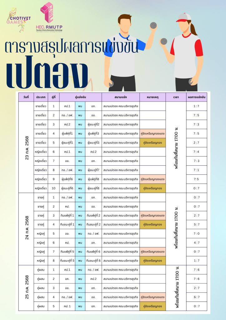 ผลการแข่งขันกีฬาเชื่อมความสัมพันธ์นักศึกษาคณะเทคโนโลยีคหกรรมศาสตร์ “โชติเวชเกมส์” ครั้งที่ 20 วันที่ 25-26 กรกฎาคม 2568 ณ โรงยิมพลศึกษา คณะศิลปศาสตร์ และสนามเปตอง คณะบริหารธุรกิจและ E-Sport