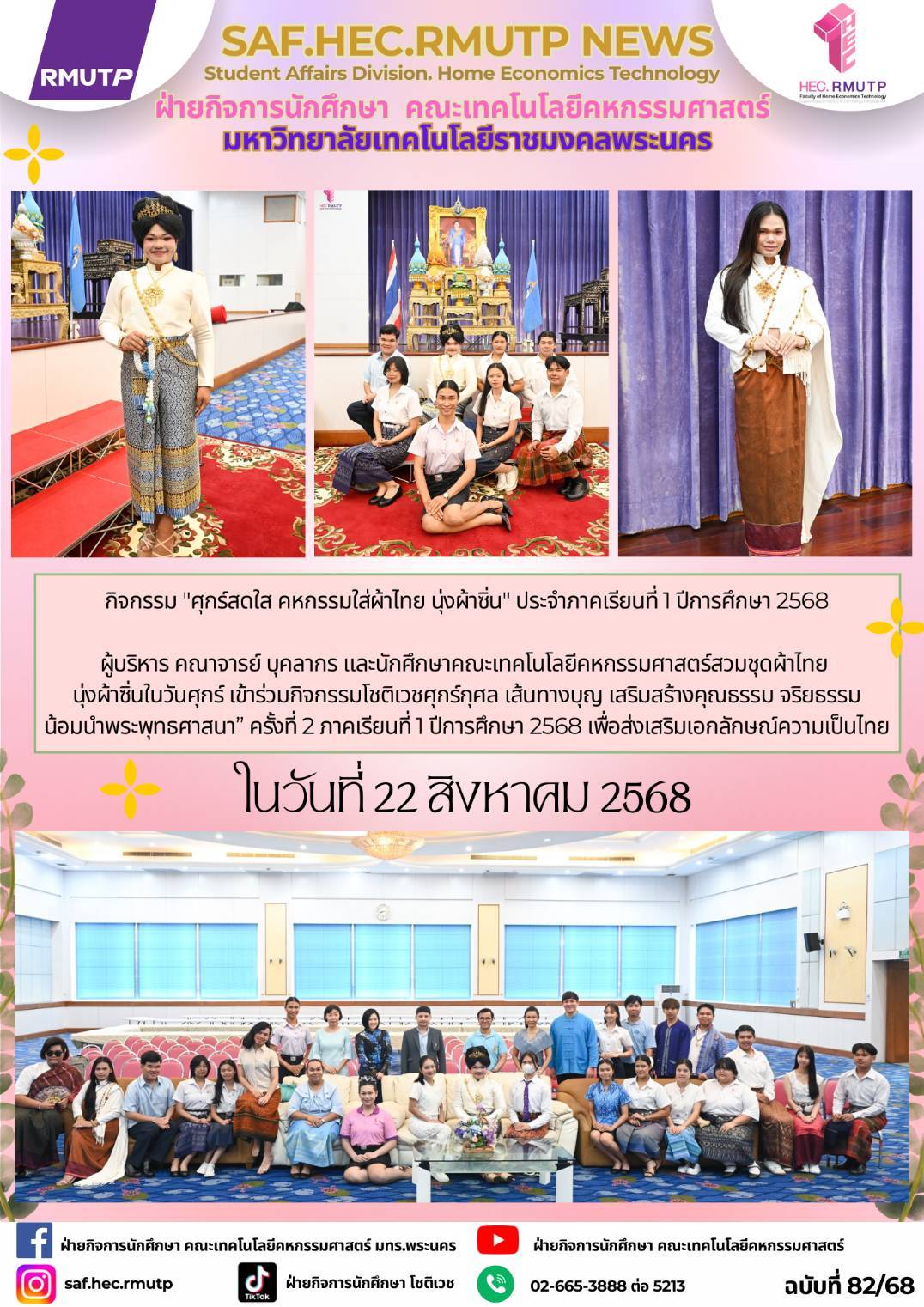 ผู้บริหาร คณาจารย์ บุคลากร และนักศึกษาคณะเทคโนโลยีคหกรรมศาสตร์สวมชุดผ้าไทย นุ่งผ้าซิ่นในวันศุกร์ เข้าร่วมกิจกรรมโชติเวชศุกร์กุศล เส้นทางบุญ เสริมสร้างคุณธรรม จริยธรรม น้อมนำพระพุทธศาสนา” ครั้งที่ 2 ภาคเรียนที่ 1