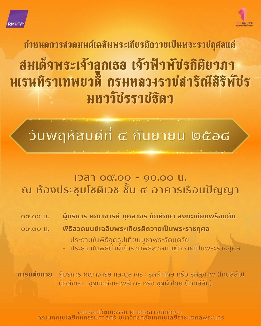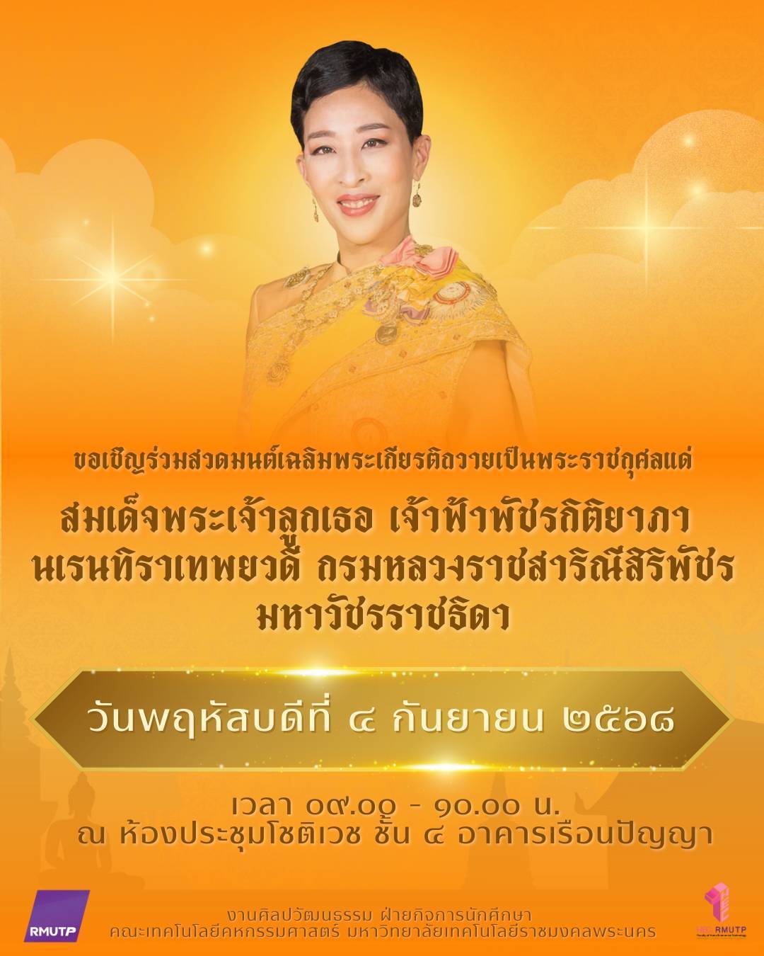 งานศิลปวัฒนธรรม ฝ่ายกิจการนักศึกษา ขอเชิญชวนผู้บริหาร คณาจารย์ บุคลากร และนักศึกษาทุกชั้นปี เข้าร่วมสวดมนต์เฉลิมพระเกียรติถวายเป็นพระราชกุศลแด่สมเด็จพระเจ้าลูกเธอ เจ้าฟ้าพัชรกิติยาภา นเรนทิราเทพยวดี กรมหลวงราชสาริณีสิริพัชร มหาวัชรราชธิดา