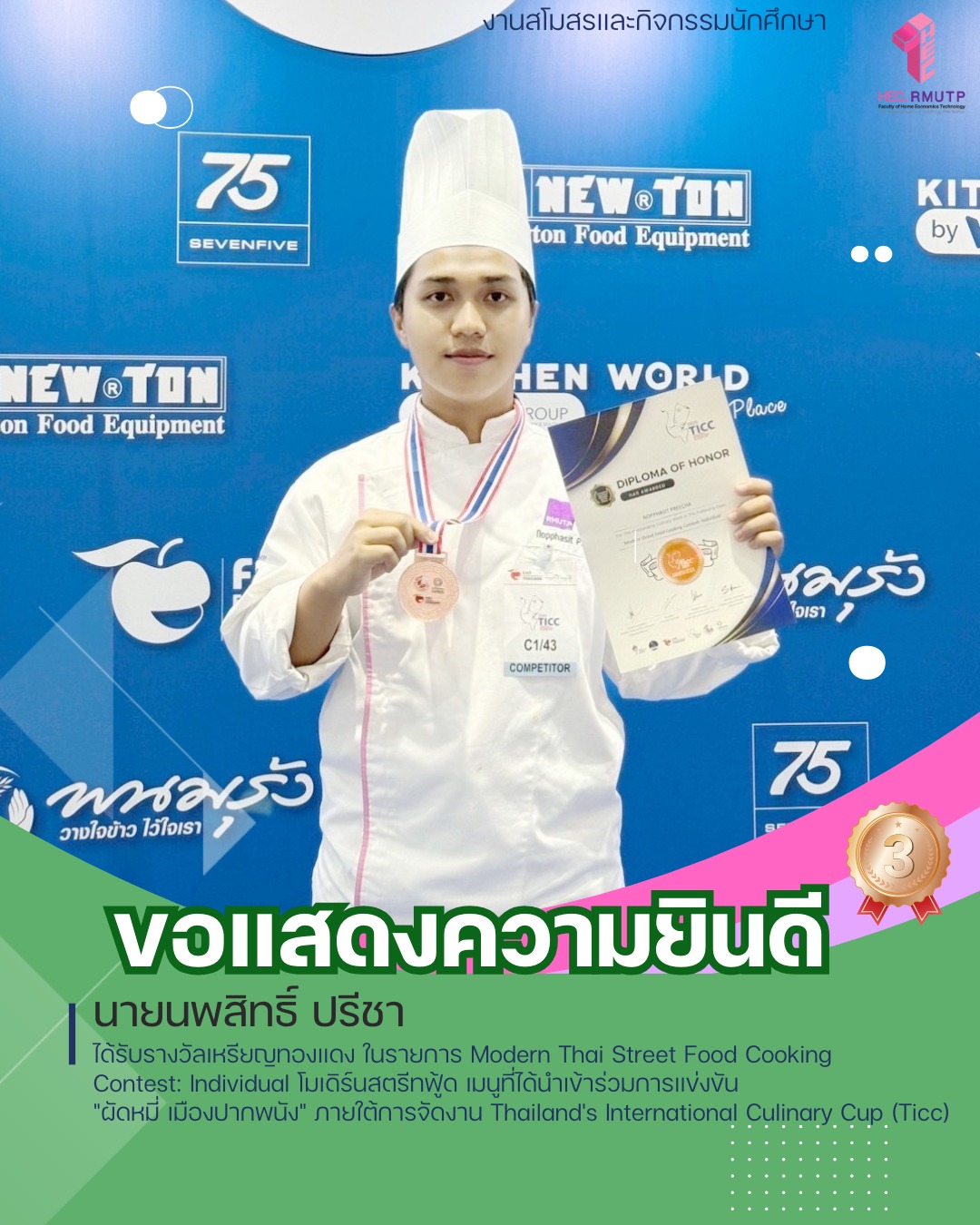 รายการ Modern Thai Street Food Cooking Contest: Individual โมเดิร์นสตรีทฟู้ด เมนูที่ได้นำเข้าร่วมการแข่งขัน “ผัดหมี่ เมืองปากพนัง” ภายใต้การจัดงาน Thailand’s International Culinary Cup (Ticc )ได้รับรางวัล “เหรียญทองแดง” ทำคะแนนได้ 78.33 คะแนน