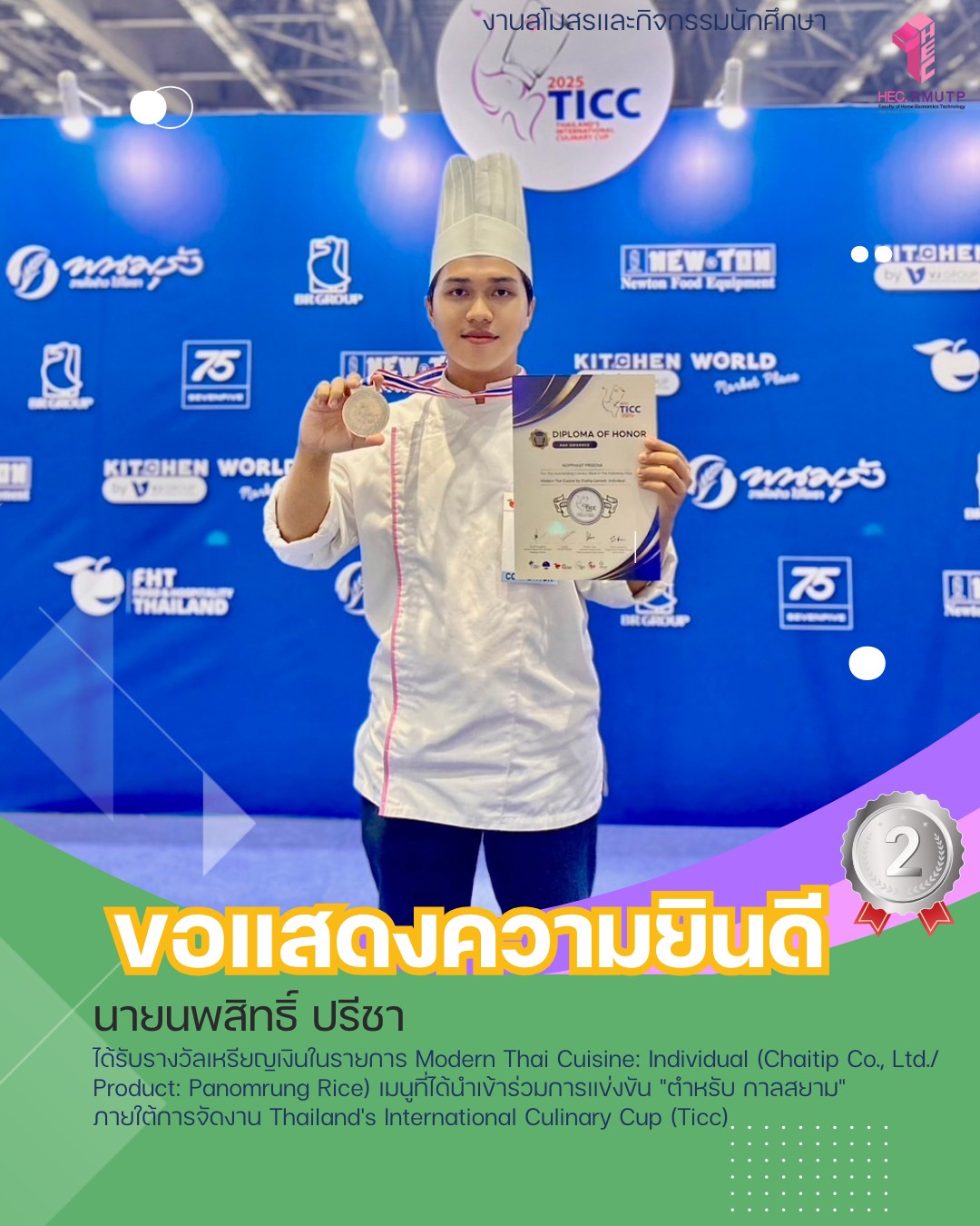 รายการ Modern Thai Cuisine: Individual (Chaitip Co., Ltd./ Product: Panomrung Rice) เมนูที่ได้นำเข้าร่วมการแข่งขัน “ตำหรับ กาลสยาม” ภายใต้การจัดงาน Thailand’s International Culinary Cup (Ticc )ได้รับรางวัล “เหรียญเงิน” ทำคะแนนได้ 85.00 คะแนน และ