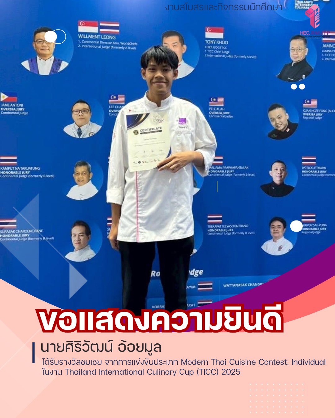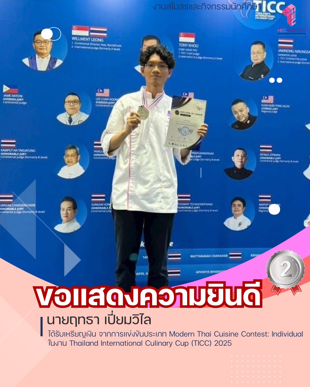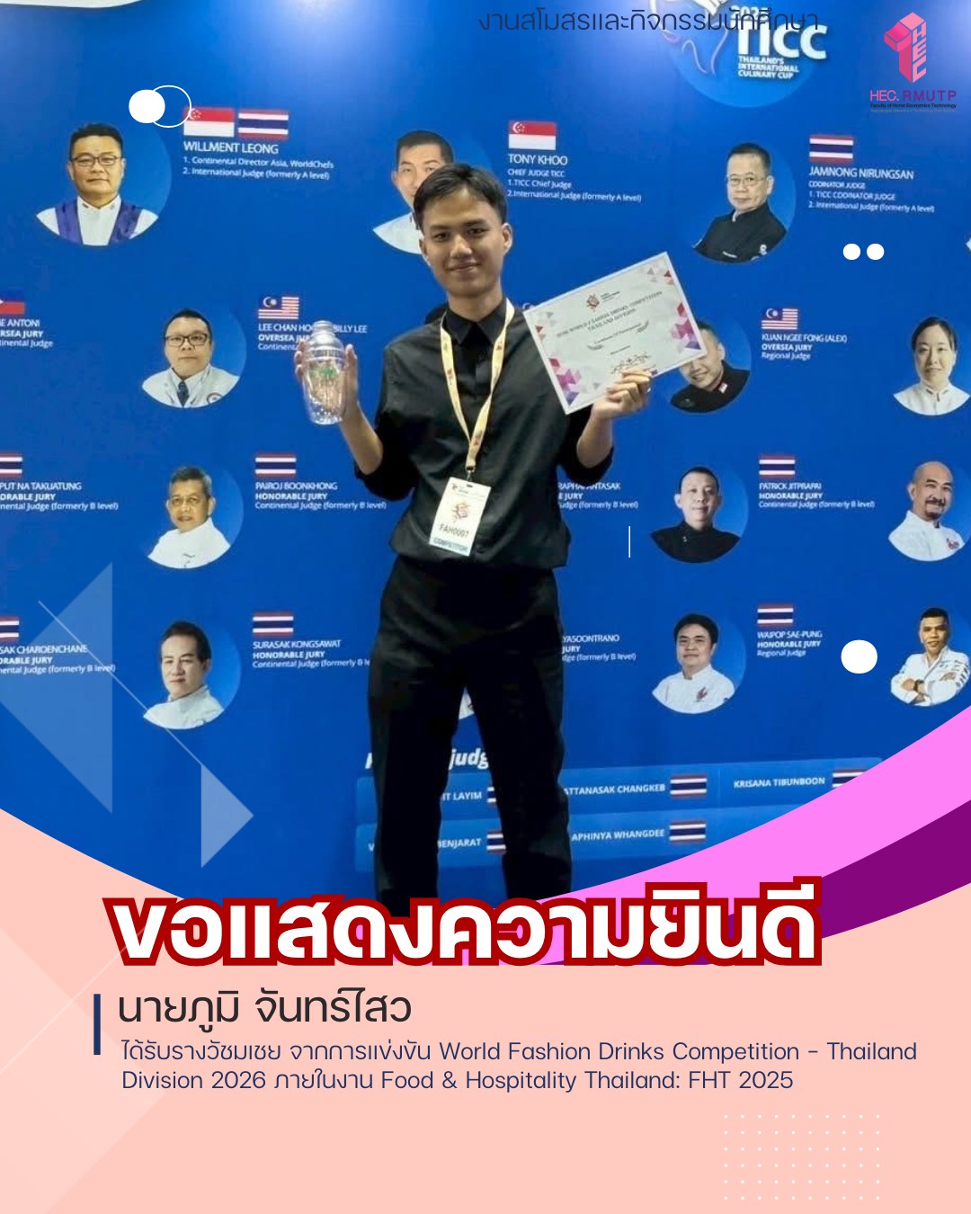 งานสโมสรและกิจกรรมนักศึกษาประชาสัมพันธ์รางวัล / ผลงานนักศึกษา สุดปัง 3 หนุ่ม จากสาขาวิชาอุตสาหกรรมการบริการอาหาร คณะเทคโนโลยีคหกรรมศาสตร์ สร้างชื่อเสียง Posted กันยายน 22, 2025 suphasit สุดปัง 3 หนุ่ม จากสาขาวิชาอุตสาหกรรมการบริการอาหาร คณะเทคโนโลยีคหกรรมศาสตร์ สร้างชื่อเสียง นายฤทธา เปี่ยมวิไล ระดับชั้นปีที่ 3 สาขาวิชาอุตสาหกรรมการบริการอาหาร ได้รับรางวัล “เหรียญเงิน” จากการแข่งขันประเภท Modern Thai Cuisine Contest: Individual ในงาน Thailand International Culinary Cup (TICC) 2025 นายศิริวัฒน์ อ้อยมูล ระดับชั้นปีที่ 3 สาขาวิชาอุตสาหกรรมการบริการอาหาร ได้รับรางวัล “ชมเชย” จากการแข่งขันประเภท Modern Thai Cuisine Contest: Individual ในงาน Thailand International Culinary Cup (TICC) 2025 นายภูมิ จันทร์ไสว นักศึกษาชั้นปีที่ 3 สาขาวิชาอุตสาหกรรมการบริการอาหาร ที่ได้รับรางวัล “ชมเชย” จากการแข่งขัน World Fashion Drinks Competition – Thailand Division 2026 ภายในงาน Food & Hospitality Thailand: FHT 2025