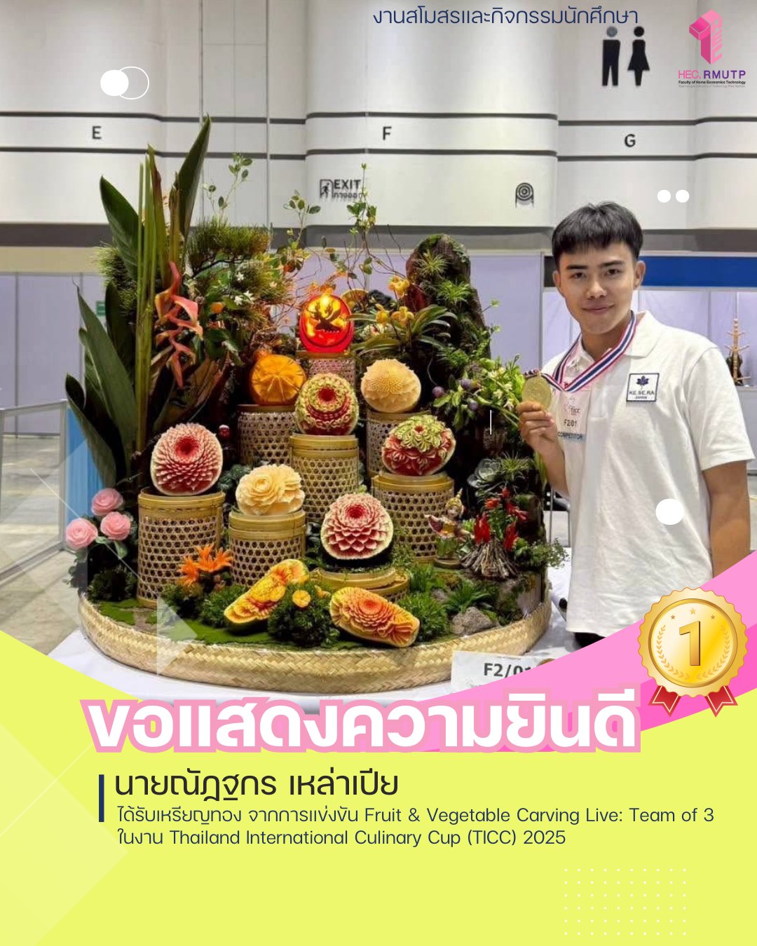 นายณัฏฐกร เหล่าเปีย ระดับชั้นปีที่ 3 สาขาวิชาคหกรรมศาสตร์ศึกษา ได้รับรางวัล “เหรียญทอง” จากการแข่งขัน Fruit & Vegetable Carving Live: Team of 3 ในงาน Thailand International Culinary Cup (TICC) 2025