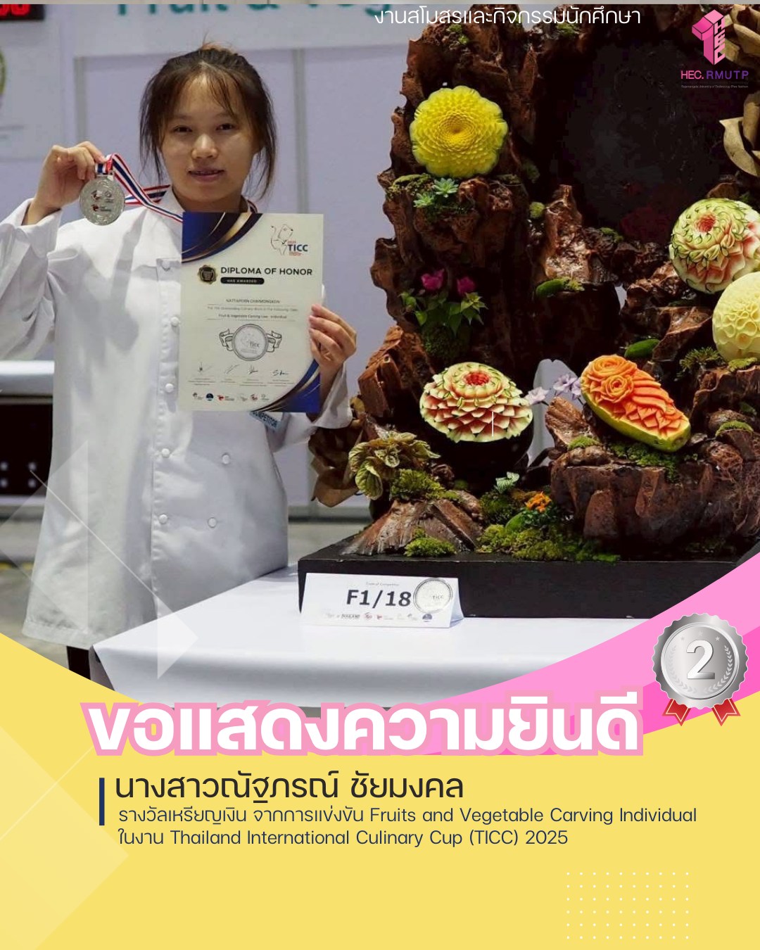นางสาวณัฐภรณ์ ชัยมงคล นักศึกษาชั้นปีที่ 3 สาขาวิชาคหกรรมศาสตร์ประยุกต์ ที่ได้รับรางวัล “เหรียญเงิน” จากการแข่งขัน Fruits and Vegetable Carving Individual ในงาน Thailand International Culinary Cup (TICC) 2025