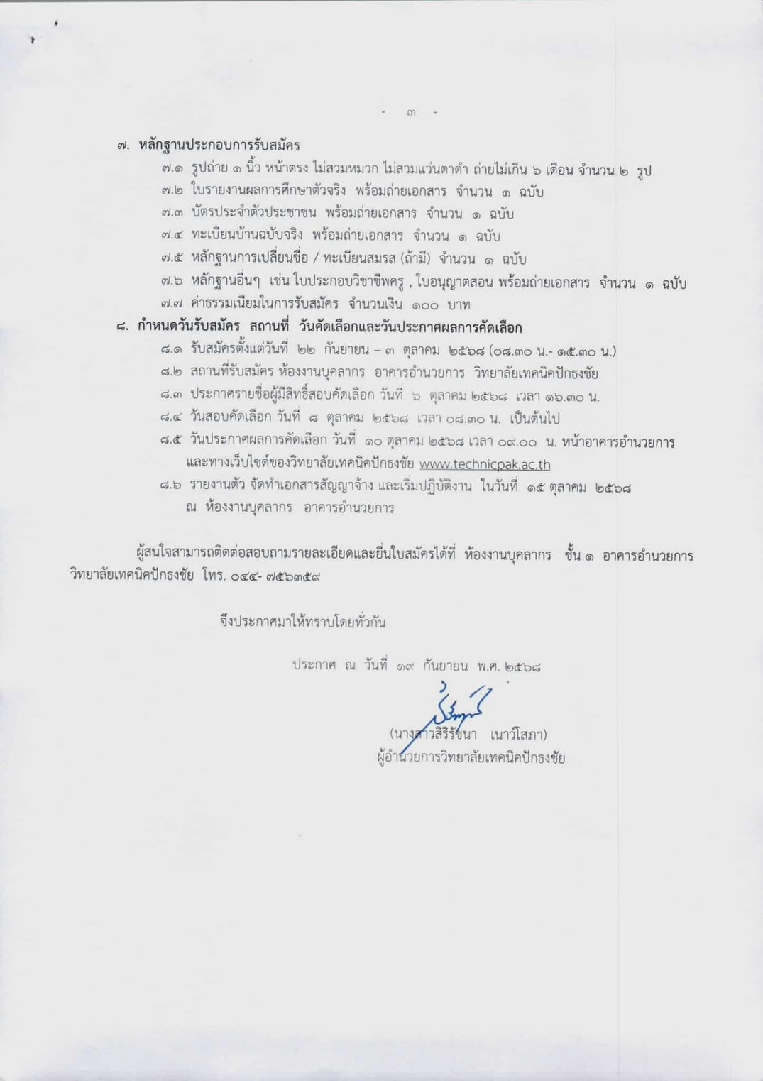 ประกาศผลสอบ : 10 ตุลาคม 2568 เวลา 09.00 น. หน้าอาคารอำนวยการ และทางเว็ปไซต์ของวิทยาลัยเทคนิคปักธงชัย www.technicpak.ac.th