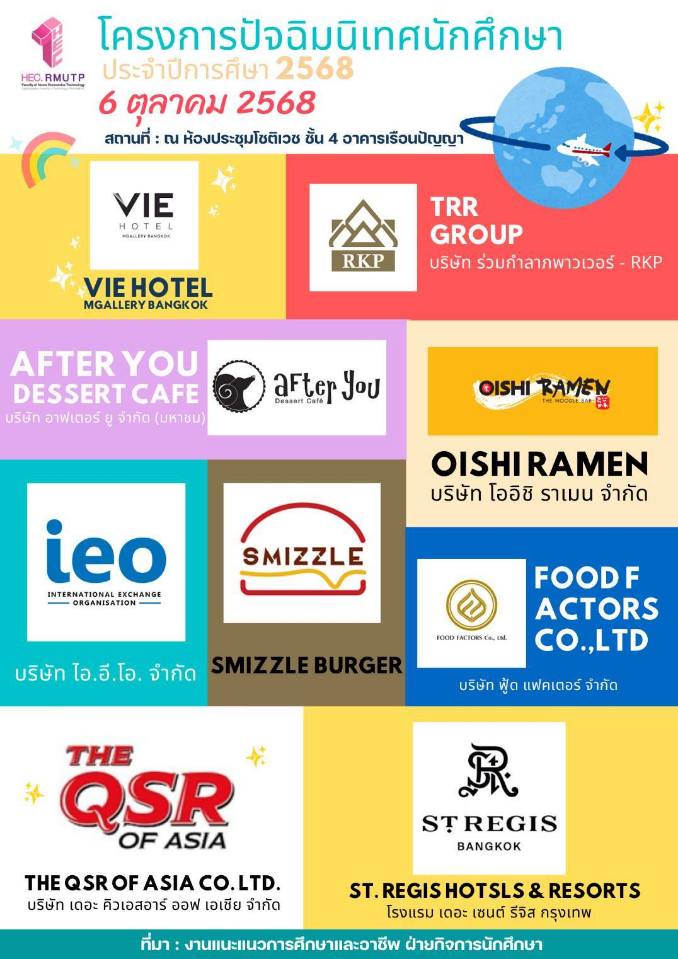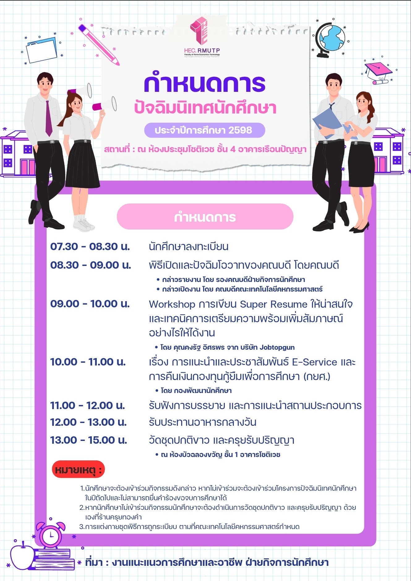 งานแนะแนวการศึกษาและอาชีพ ฝ่ายกิจการนักศึกษา คณะเทคโนโลยีคหกรรมศาสตร์ มหาวิทยาลัยเทคโนโลยีราชมงคลพระนคร ขอเชิญนักศึกษาชั้นปีที่ 4 และนักศึกษาเทียบโอน (เฉพาะนักศึกษารหัส 65 และเทียบโอนรหัส 68) เข้าร่วม