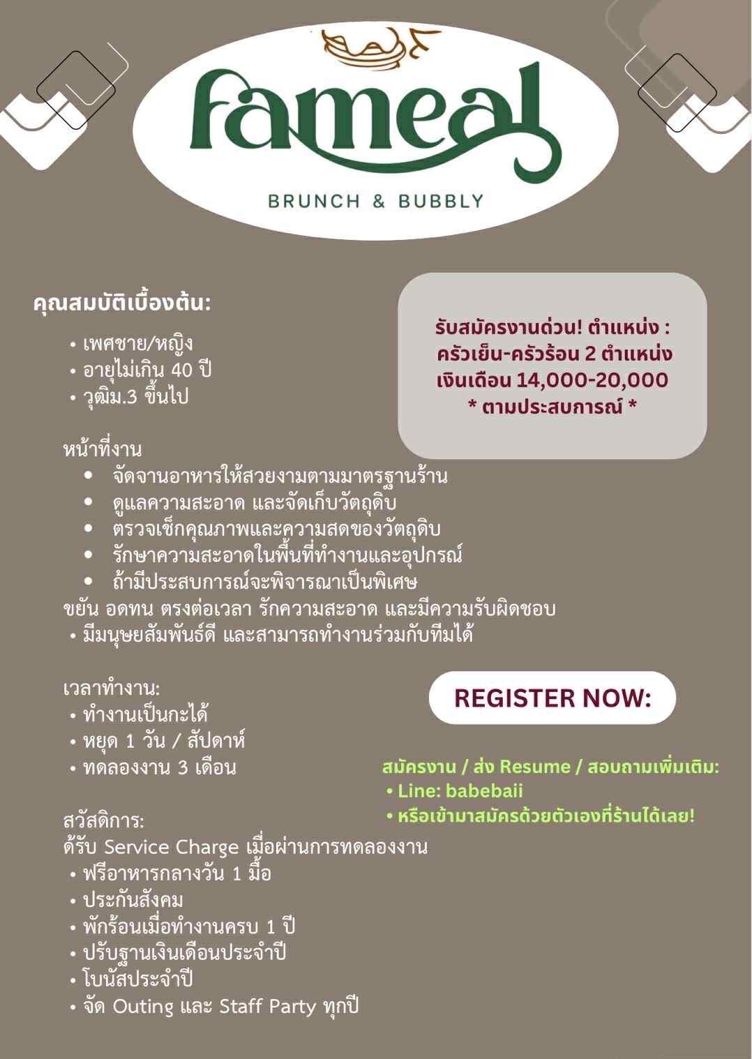 ข่าวรับสมัครงานงานแนะแนวการศึกษาและอาชีพประชาสัมพันธ์ Fameal Brunch & Bubbly เปิดรับสมัครด่วน!! Posted กันยายน 26, 2025 suphasit Fameal Brunch & Bubbly เปิดรับสมัครด่วน!! ใครที่รักการทำอาหาร อยากทำงานกับทีมบรรยากาศอบอุ่น ต้องไม่พลาด ตำแหน่งที่เปิดรับ ครัวเย็น – ครัวร้อน (2 ตำแหน่ง) เงินเดือน 14,000 – 20,000 บาท (ขึ้นอยู่กับประสบการณ์) คุณสมบัติที่มองหา เพศชาย/หญิง อายุไม่เกิน 40 ปี วุฒิ ม.3 ขึ้นไป ขยัน อดทน ตรงต่อเวลา รักความสะอาด มีใจรักการทำอาหารและการบริการ มีมนุษยสัมพันธ์ดี ทำงานเป็นทีมได้ สิ่งที่คุณจะได้รับ Service Charge (หลังผ่านโปร) อาหารกลางวันฟรีทุกวัน ประกันสังคม ปรับเงินเดือนประจำปี + โบนัสประจำปี Outing และ Staff Party สนุก ๆ ทุกปี! ทำงานเป็นกะ | หยุด 1 วัน/สัปดาห์ | ทดลองงาน 3 เดือน — สมัครงาน / ส่ง Resume / สอบถามรายละเอียดเพิ่มเติม Line: babebaii หรือมาสมัครด้วยตัวเองที่ร้านได้ทันที