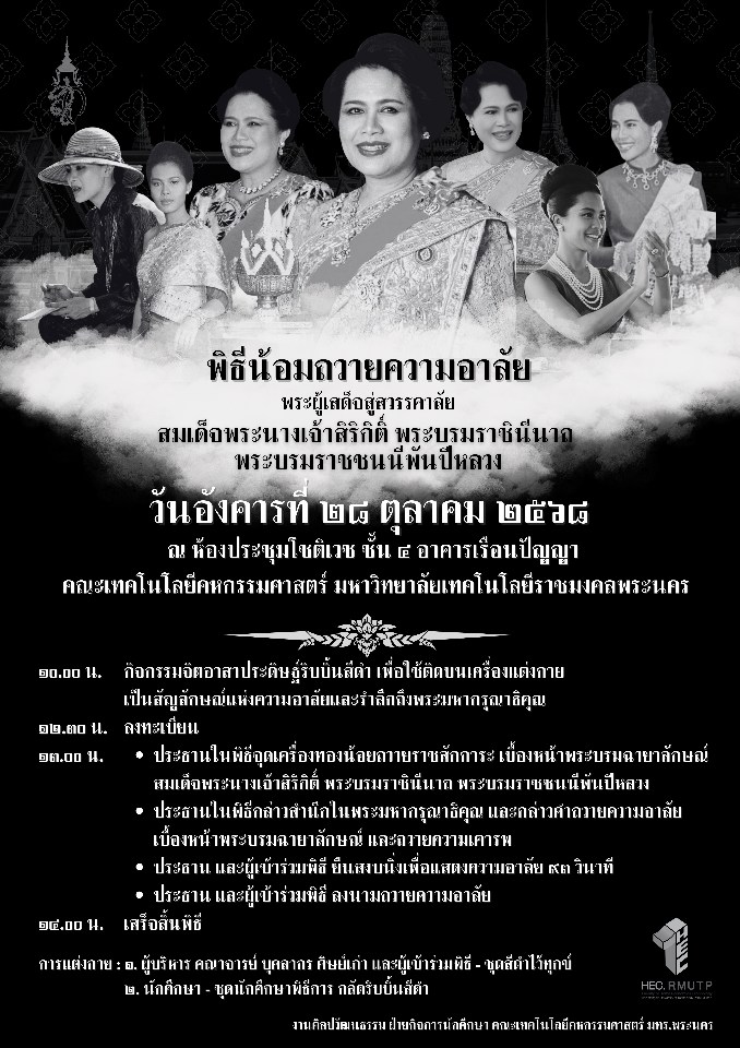 ขอเชิญ ผู้บริหาร คณาจารย์ บุคลากร นักศึกษา ศิษย์เก่าคณะเทคโนโลยีคหกรรมศาสตร์ และผู้สนใจเข้าร่วมพิธีน้อมถวายความอาลัย และเชิญจิตอาสาประดิษฐ์ริบบิ้นสีดำ เพื่อใช้ติดบนเครื่องแต่งกายเป็นสัญลักษณ์ แห่งความอาลัยและรำลึกถึงพระมหากรุณาธิคุณ