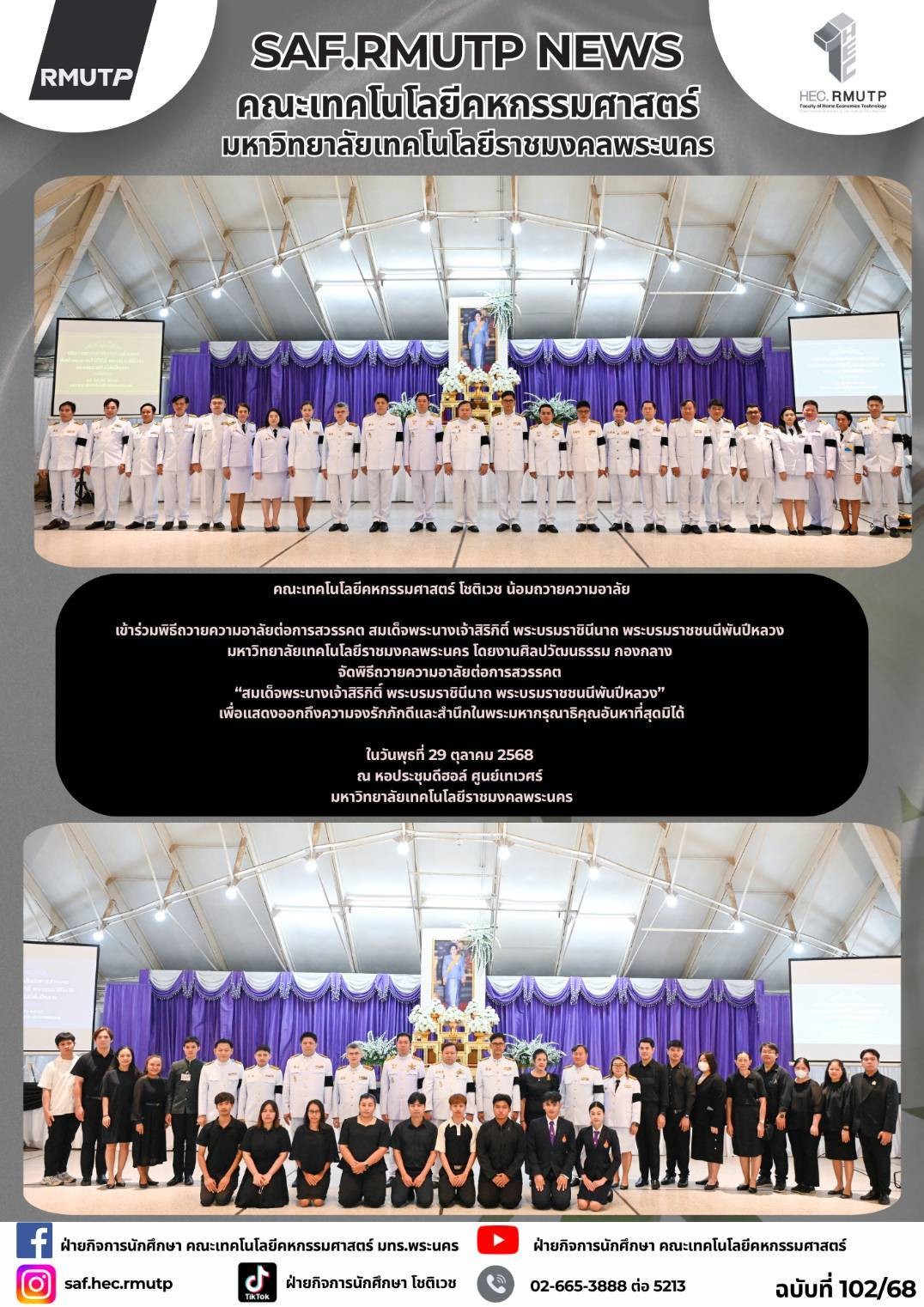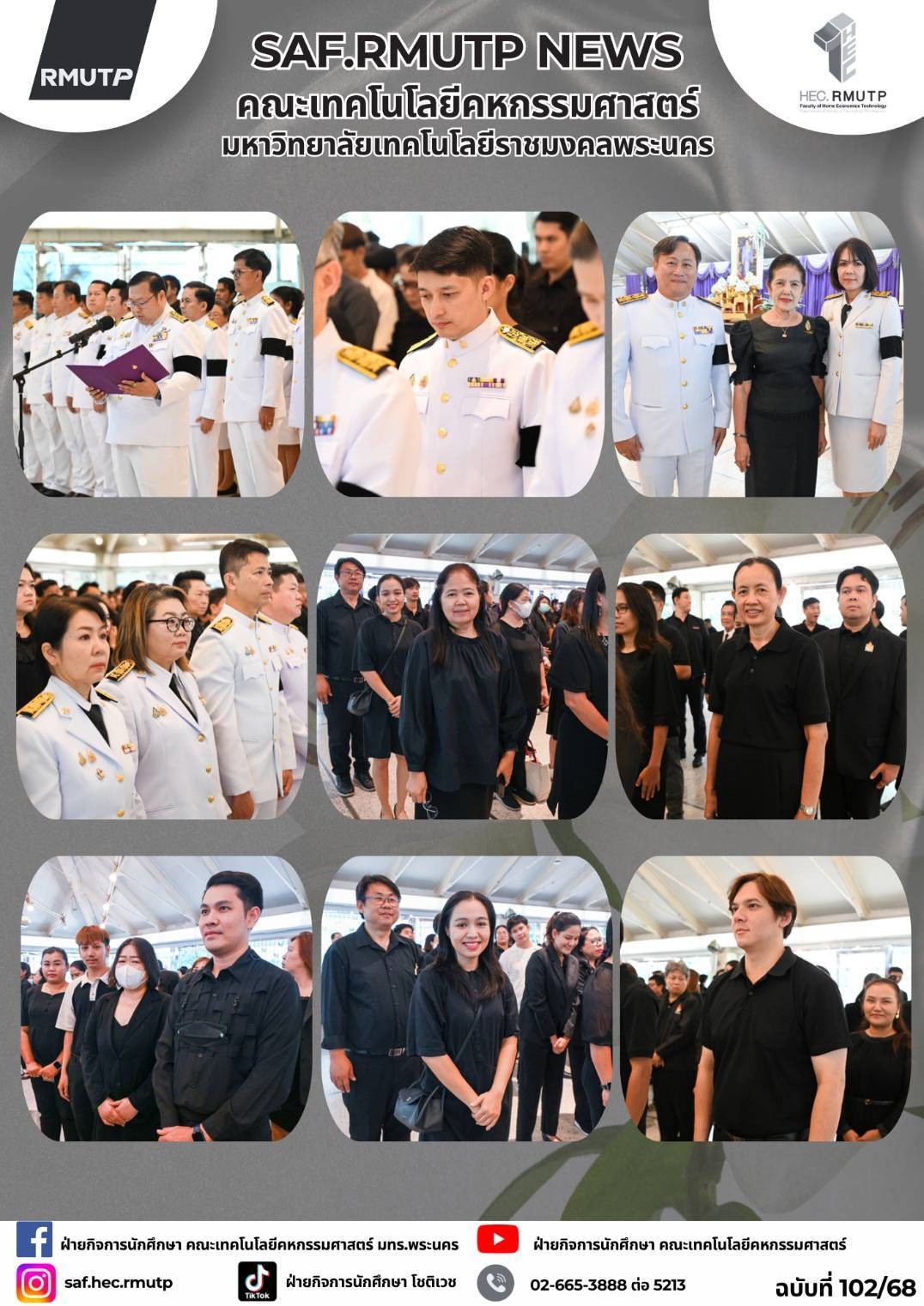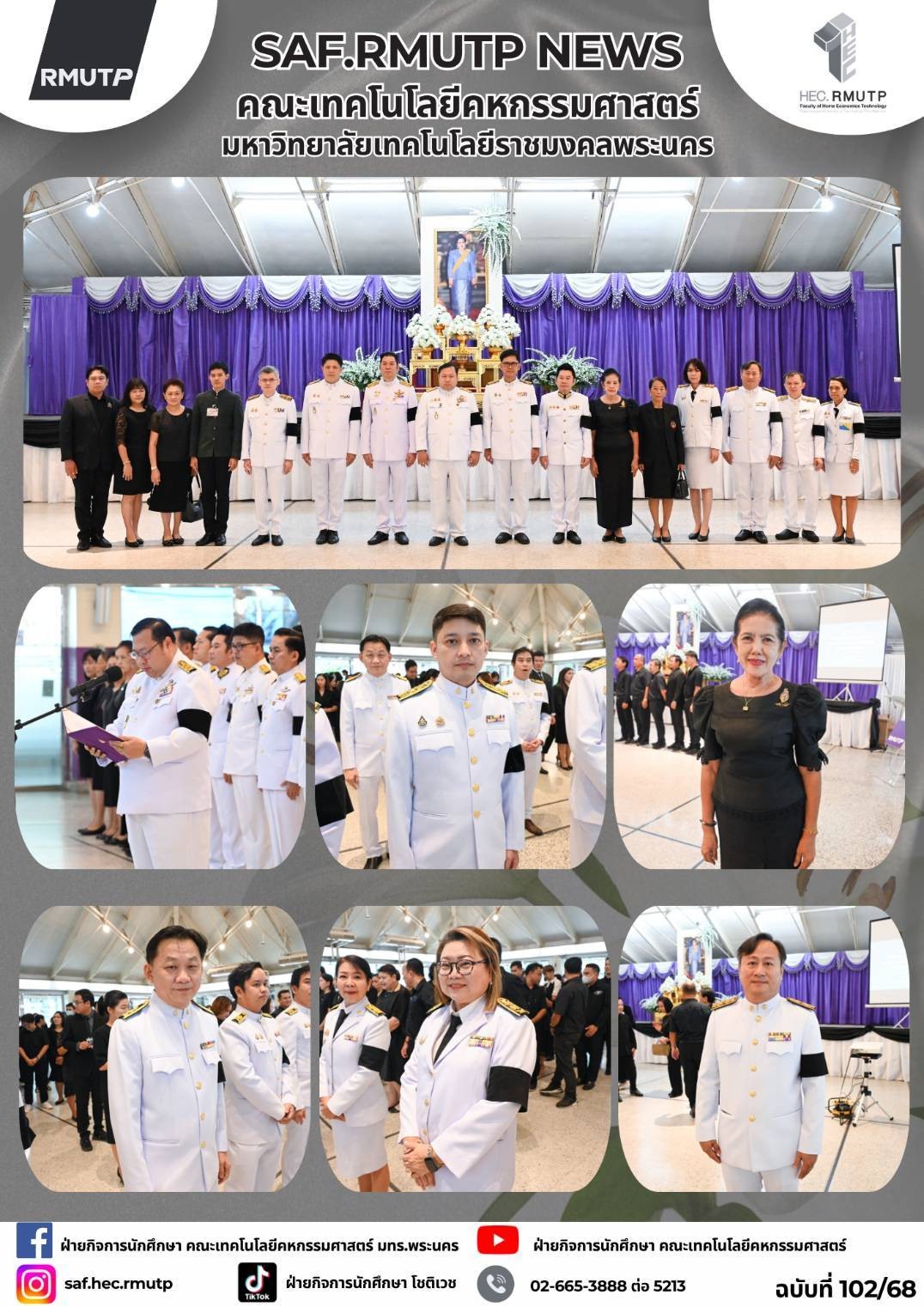 เข้าร่วมพิธีถวายความอาลัยต่อการสวรรคต สมเด็จพระนางเจ้าสิริกิติ์ พระบรมราชินีนาถ พระบรมราชชนนีพันปีหลวง โดยงานศิลปวัฒนธรรม กองกลาง มหาวิทยาลัยเทคโนโลยีราชมงคลพระนคร จัดพิธีถวายความอาลัยต่อการสวรรคต “สมเด็จพระนางเจ้าสิริกิติ์ พระบรมราชินีนาถ พระบรมราชชนนีพันปีหลวง” เพื่อแสดงออกถึงความจงรักภักดีและสำนึกในพระมหากรุณาธิคุณอันหาที่สุดมิได้