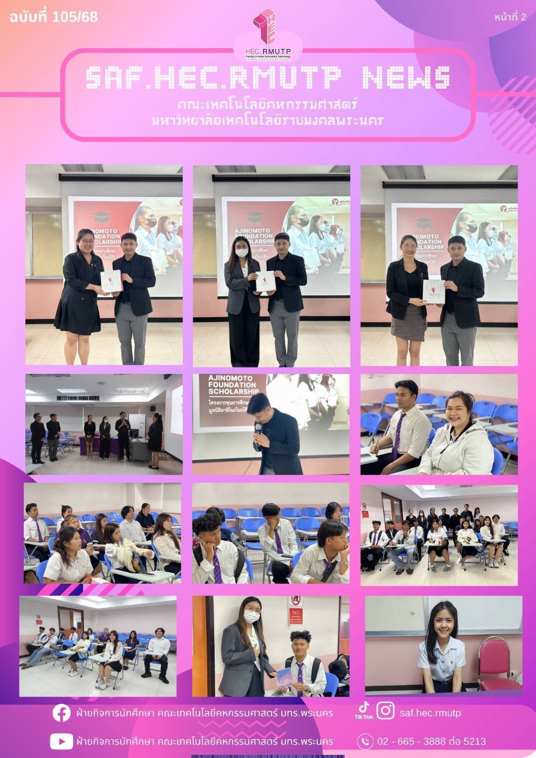 งานสวัสดิการและการบริการนักศึกษา ฝ่ายกิจการนักศึกษา ได้รับมอบหมาย ดำเนินกิจกรรมประชาสัมพันธ์ โครงการทุนการศึกษามูลนิธิอายิโนะโมะโต๊ะ ให้กับนักศึกษาคณะเทคโนโลยีคกรรมศาสตร์