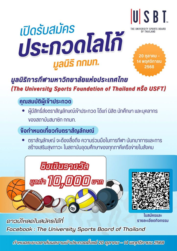 คณะกรรมการกีฬามหาวิทยาลัยแห่งประเทศไทย ขอเชิญนิสิต นักศึกษา และบุคลากรของสถาบันสมาชิก เข้าร่วมประกวดออกแบบตราสัญลักษณ์ “มูลนิธิการกีฬามหาวิทยาลัยแห่งประเทศไทย” เพื่อสร้างอัตลักษณ์ที่ชัดเจนและสื่อสารให้หน่วยงานที่เกี่ยวข้องได้ทราบถึงความสำคัญบทบาทและหน้าที่ของมูลนิธิ ชิงเงินรางวัลมูลค่า 10,000 บาท