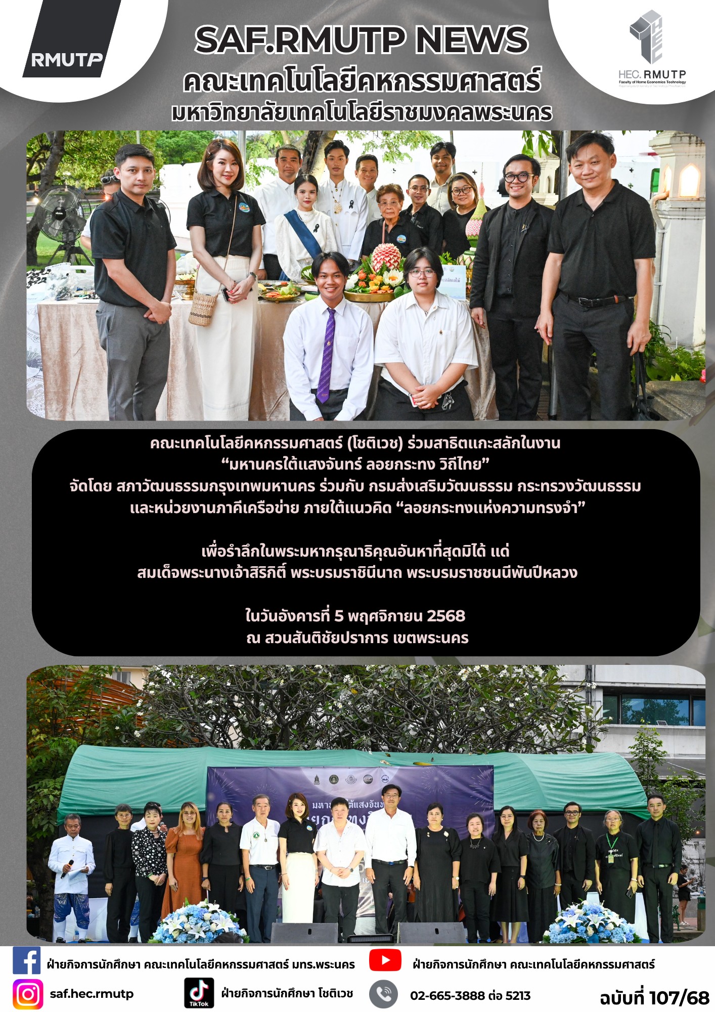 “มหานครใต้แสงจันทร์ ลอยกระทง วิถีไทย” จัดโดย สภาวัฒนธรรมกรุงเทพมหานคร ร่วมกับ กรมส่งเสริมวัฒนธรรม กระทรวงวัฒนธรรม และหน่วยงานภาคีเครือข่าย ภายใต้แนวคิด “ลอยกระทงแห่งความทรงจำ” เพื่อรำลึกในพระมหากรุณาธิคุณอันหาที่สุดมิได้ แด่ สมเด็จพระนางเจ้าสิริกิติ์ พระบรมราชินีนาถ พระบรมราชชนนีพันปีหลวง ผู้ทรงอุทิศพระวรกายและพระราชหฤทัยในการธำรงรักษาและสืบสานศิลปวัฒนธรรมไทยอันเป็นสมบัติอันล้ำค่าของชาติ โดยเชิญชวนคณะเทคโนโลยีคหกรรมศาสตร์ (โชติเวช) ร่วมสาธิตการแกะสลักผักและผลไม้ ในงานงานดังกล่าว