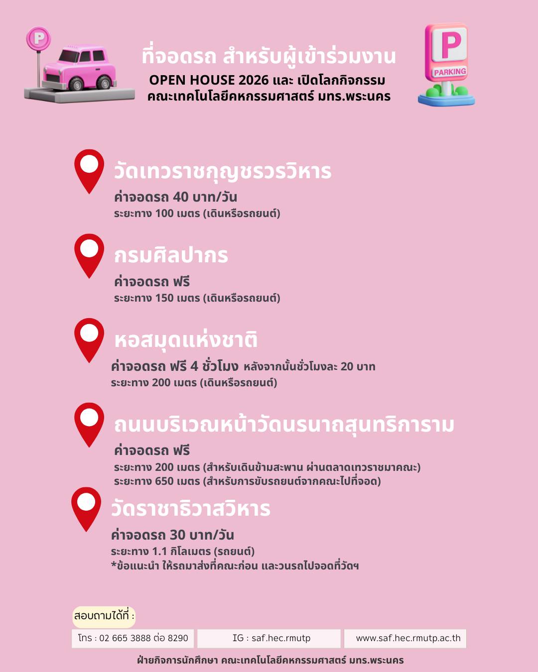 เนื่องจากพื้นที่ของคณะไม่สามารถรองรับรถยนต์ได้เพียงพอ ท่านสามารถเลือกสถานที่จอดได้ตามนี้