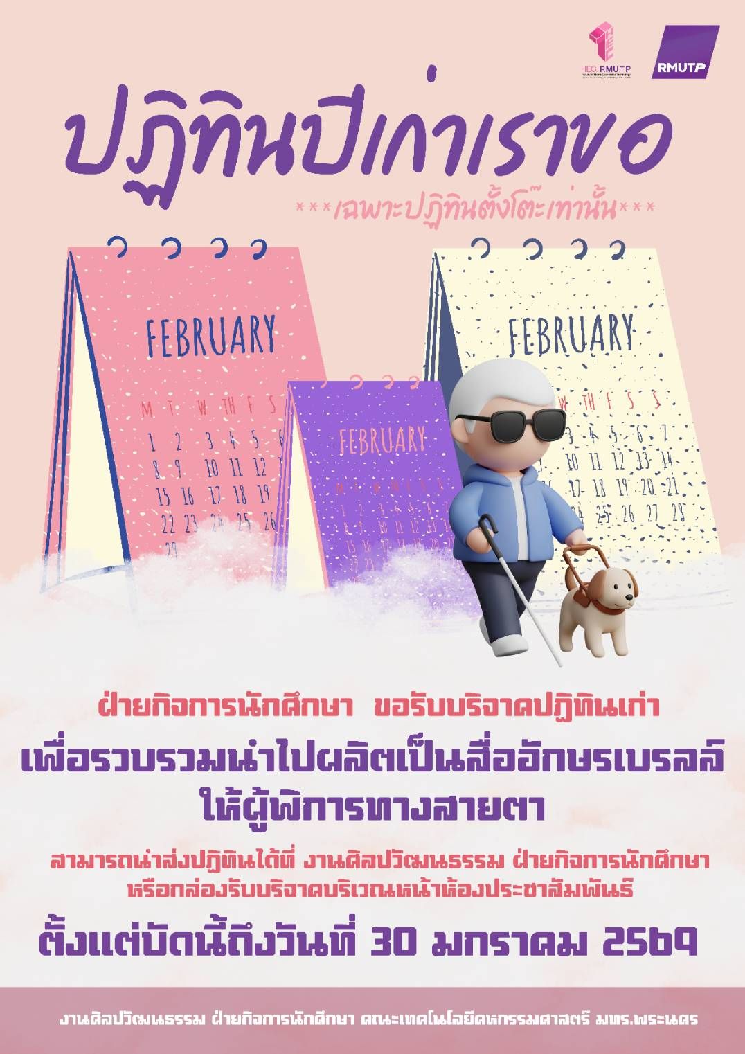 ขอเชิญชวนทุกท่านร่วมบริจาค “ปฏิทินเก่า” เพื่อรวบรวมนำไปผลิตเป็นสื่ออักษรเบรลล์ให้ผู้พิการทางสายตา ทางงานศิลปวัฒนธรรม