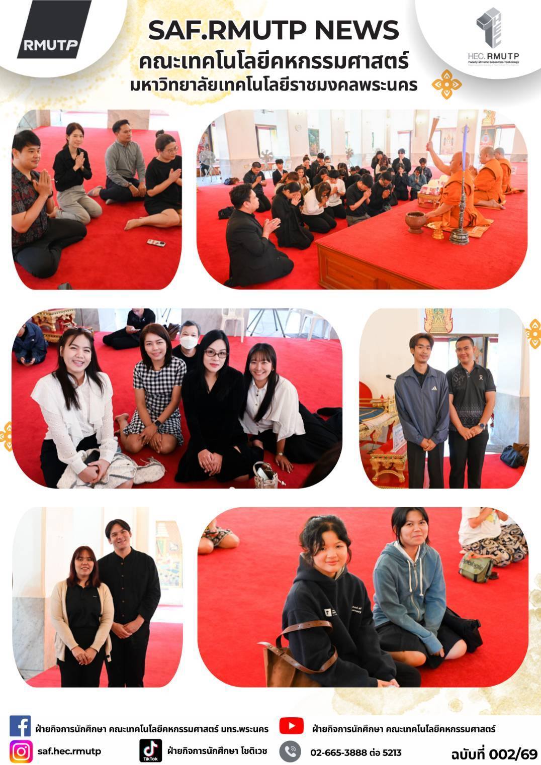 โดยมี ผู้ช่วยศาสตราจารย์ ดร.ธนภพ โสตรโยม คณบดีคณะเทคโนโลยีคหกรรมศาสตร์ เป็นประธานจุดธูปเทียน พร้อมด้วย ผู้ช่วยศาสตราจารย์ ดร.เชาวลิต อุปฐาก รองคณบดีฝ่ายกิจการนักศึกษา ผู้บริหาร คณาจารย์ บุคลากร และนักศึกษาคณะเทคโนโลยีคหกรรมศาสตร์ เข้าร่วมกิจกรรมดังกล่าว โดยถวายเครื่องไทยธรรม สังฆทานพร้อมปัจจัย เพื่อทำนุบำรุงพระพุทธศาสนาและสืบสานศิลปวัฒนธรรมไทย