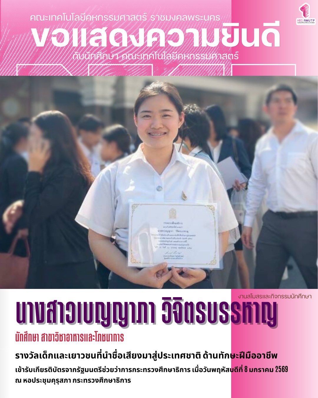 และ นางสาวเบญญาภา วิจิตรบรรหาญ นักศึกษาคณะเทคโนโลยีคหกรรมศาสตร์ สาขาวิชาอาหารและโภชนาการ ได้รับรางวัลเด็กและเยาวชนที่นำชื่อเสียงมาสู่ประเทศชาติ ด้านทักษะฝีมืออาชีพ มีกำหนดเข้ารับเกียรติบัตรจากรัฐมนตรีช่วยว่าการกระทรวงศึกษาธิการ เมื่อวันพฤหัสบดีที่ 8 มกราคม 2569 ณ หอประชุมคุรุสภา กระทรวงศึกษาธิการ
