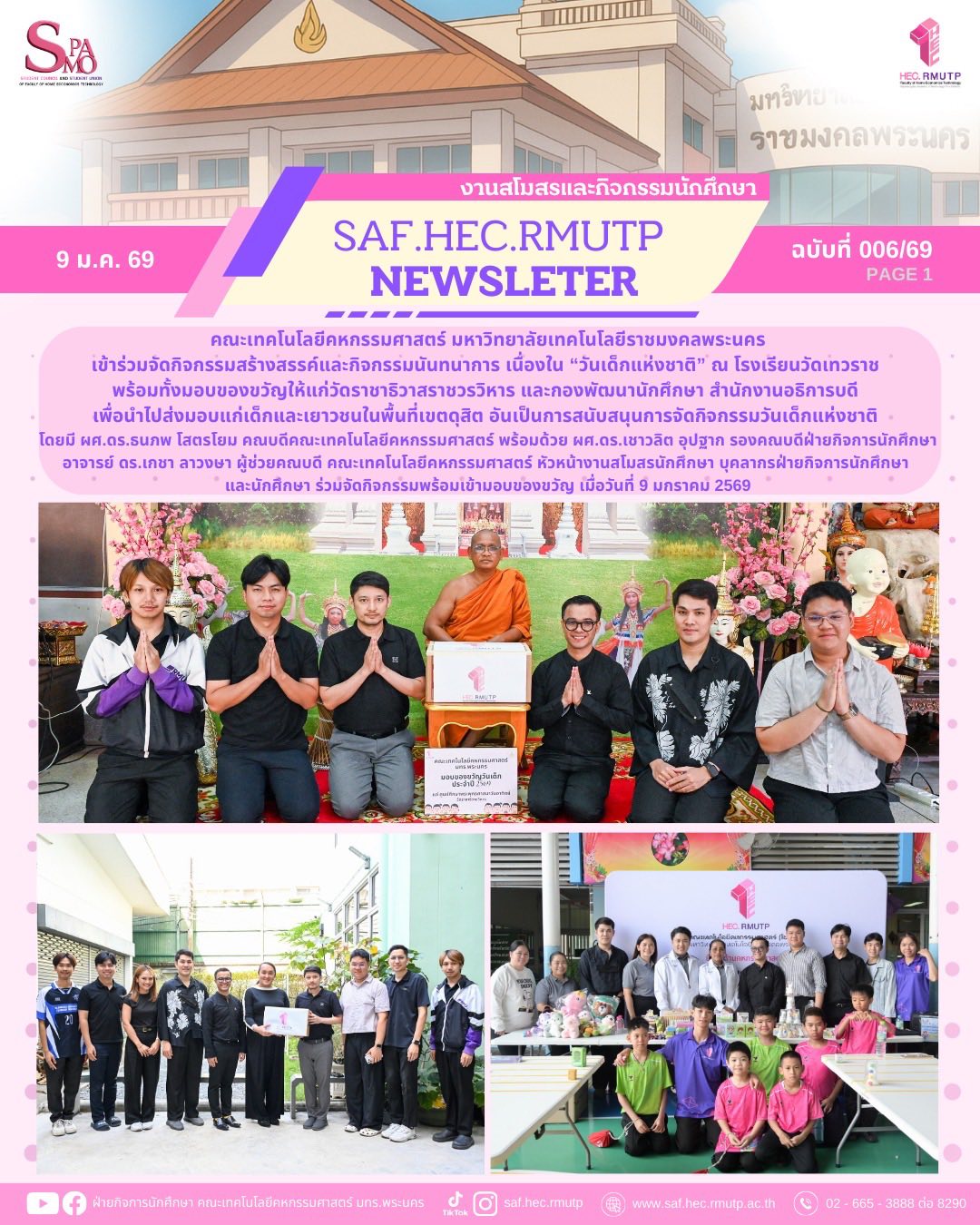 คณะเทคโนโลยีคหกรรมศาสตร์ มหาวิทยาลัยเทคโนโลยีราชมงคลพระนคร เข้าร่วมจัดกิจกรรมสร้างสรรค์และกิจกรรมนันทนาการ เนื่องใน “วันเด็กแห่งชาติ” ณ โรงเรียนวัดเทวราช พร้อมทั้งมอบของขวัญให้แก่วัดราชาธิวาสราชวรวิหาร และกองพัฒนานักศึกษา สำนักงานอธิการบดี เพื่อนำไปส่งมอบแก่เด็กและเยาวชนในพื้นที่เขตดุสิต อันเป็นการสนับสนุนการจัดกิจกรรมวันเด็กแห่งชาติ