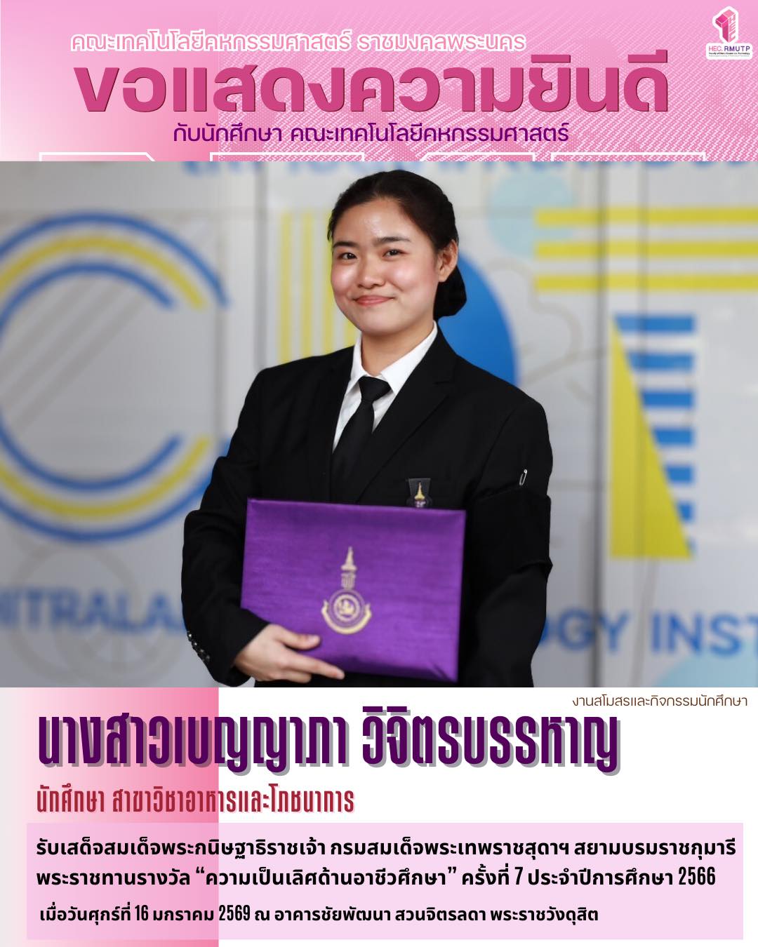 นางสาวเบญญาภา วิจิตรบรรหาญ นักศึกษา สาขาวิชาอาหารและโภชนาการ ร่วมเฝ้าฯ รับเสด็จสมเด็จพระกนิษฐาธิราชเจ้า กรมสมเด็จพระเทพรัตนราชสุดาฯ สยามบรมราชกุมารี พระราชทานพระราชวโรกาสให้ นักศึกษาเข้ารับพระราชทานรางวัล “ความเป็นเลิศด้านอาชีวศึกษา” ครั้งที่ 7 ประจำปีการศึกษา 2566 เมื่อวันศุกร์ที่ 16 มกราคม 2569 ณ อาคารชัยพัฒนา สวนจิตรลดา พระราชวังดุสิต