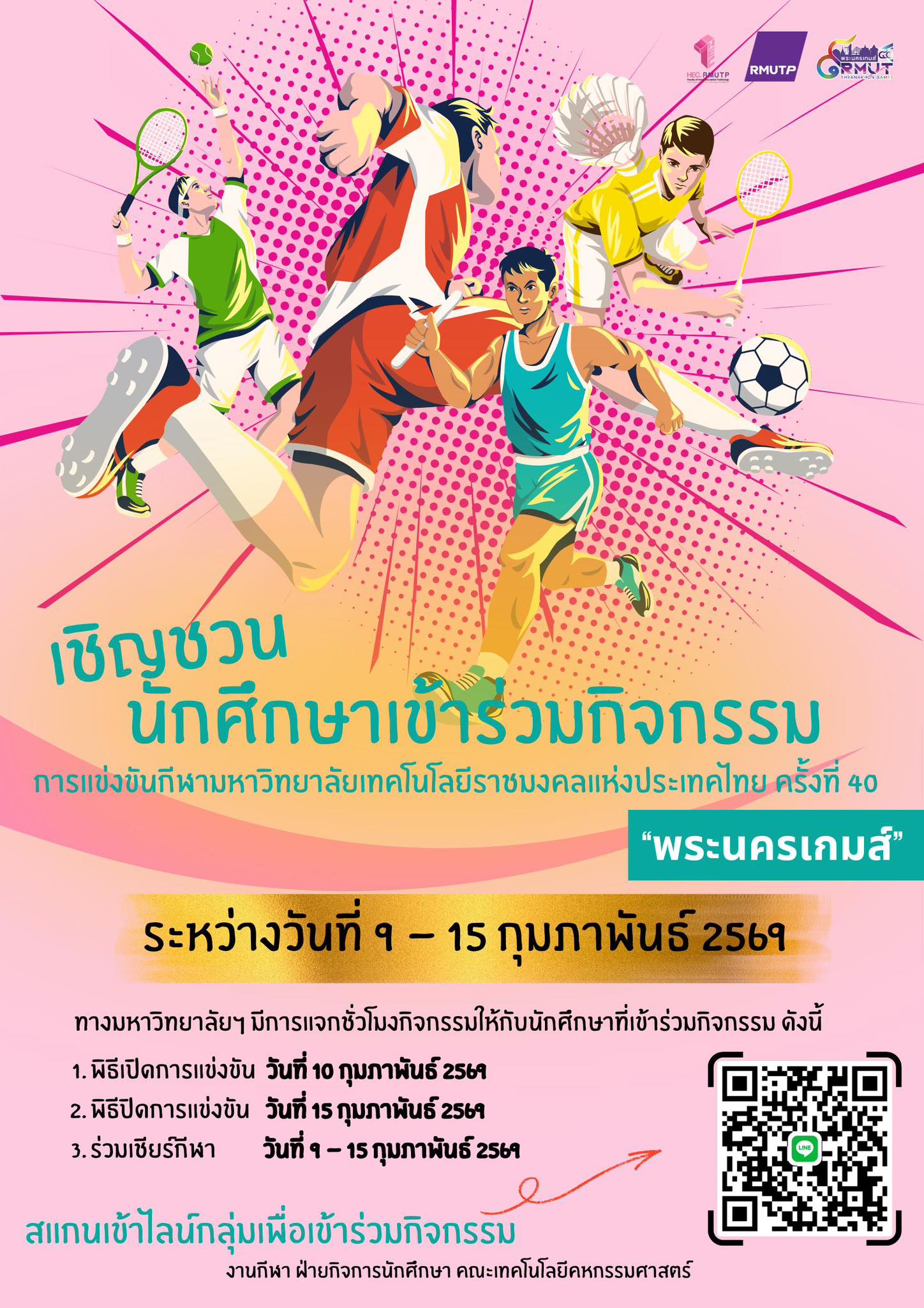 เชิญชวนนักศึกษาเข้าร่วมกิจกรรมการแข่งขันกีฬามหาวิทยาลัยเทคโนโลยีราชมงคลแห่งประเทศไทย ครั้งที่ 40 “พระนครเกมส์”