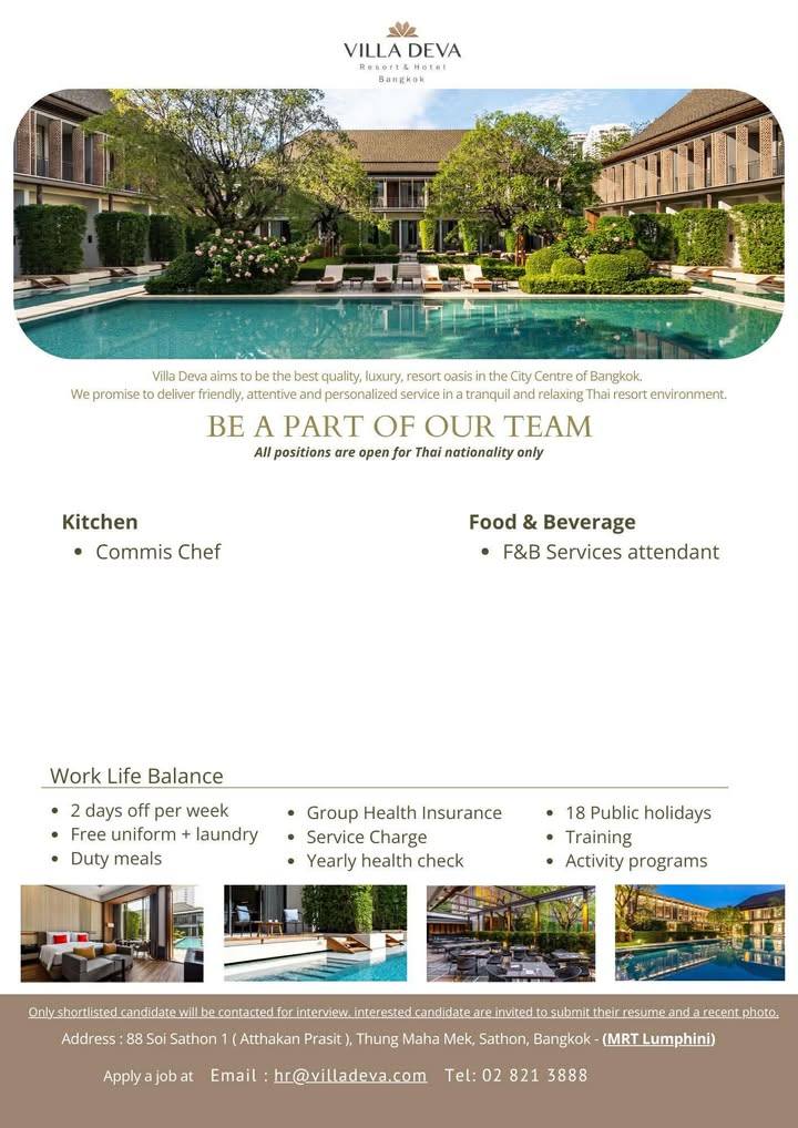 โรงแรม Villa Deva Resort & Hotel Bangkok เปิดรับสมัครบุคลากรร่วมเป็นส่วนหนึ่งของทีมงาน เพื่อร่วมสร้างประสบการณ์การบริการระดับพรีเมียมใจกลางกรุงเทพฯ