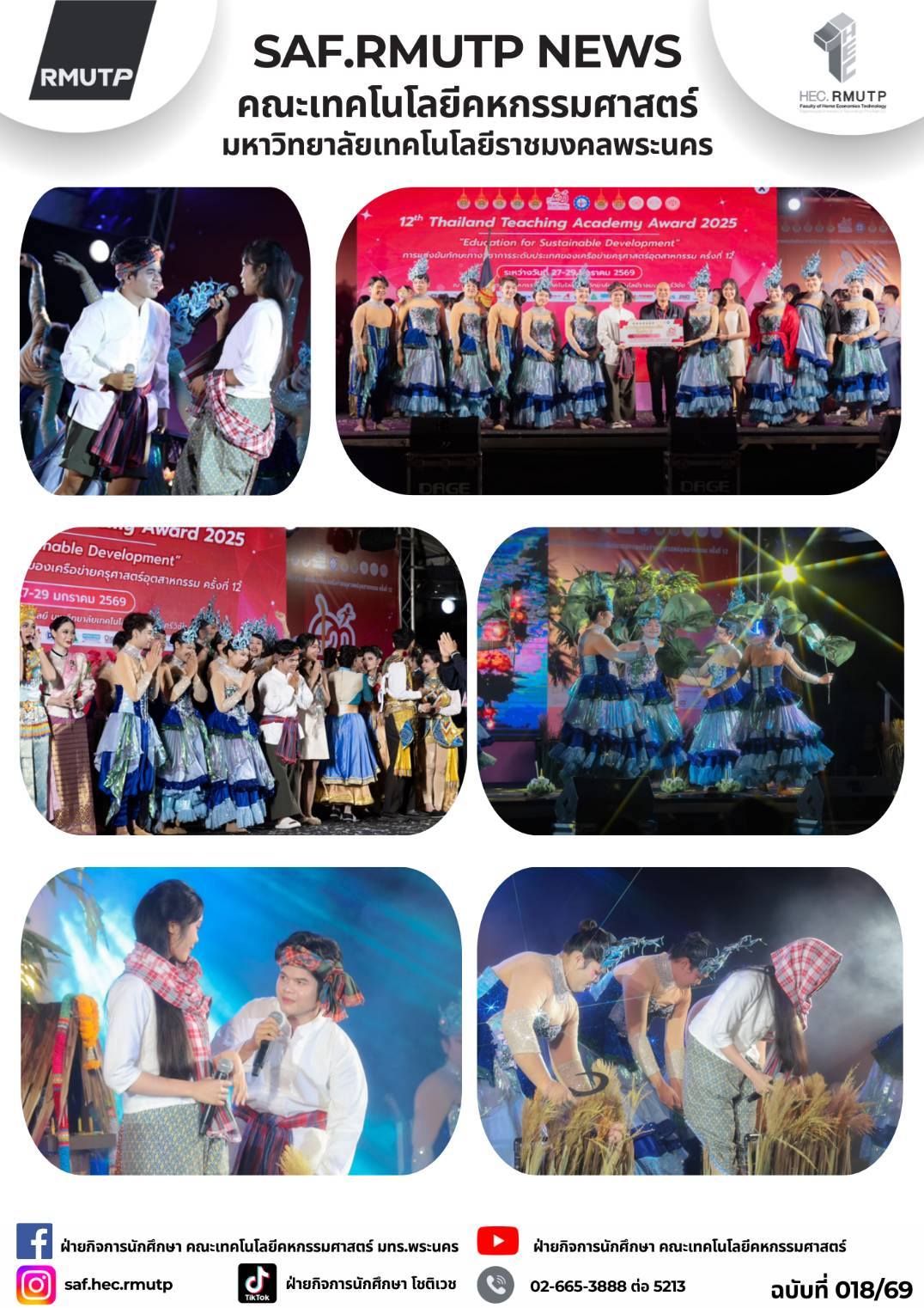 คณะเทคโนโลยีคหกรรมศาสตร์ (โชติเวช) มหาวิทยาลัยเทคโนโลยีราชมงคลพระนคร ขอแสดงความยินดีและถ่ายภาพร่วมกัน กับความสำเร็จของนักศึกษาจากหลักสูตรศึกษาศาสตรบัณฑิต สาขาวิชาคหกรรมศาสตรศึกษา ระดับปริญญาตรี ชั้นปีที่ 1 ได้รับรางวัลรองชนะเลิศอันดับ 2 ระดับเหรียญทอง ในการเข้าร่วมการแข่งขันทางวิชาการ Thailand Teaching Academy Award 2025 (12) ประเภท : ประกวดการแสดงศิลปวัฒนธรรมผ่านบทแพลงไทยลูกทุ่ง เมื่อวันอังคารที่ 27 มกราคม 2569 ณ คณะครุศาสตร์อุตสาหกรรมและเทคโนโลยี มหาวิทยาลัยเทคโนโลยีราชมงคลศรีวิชัย