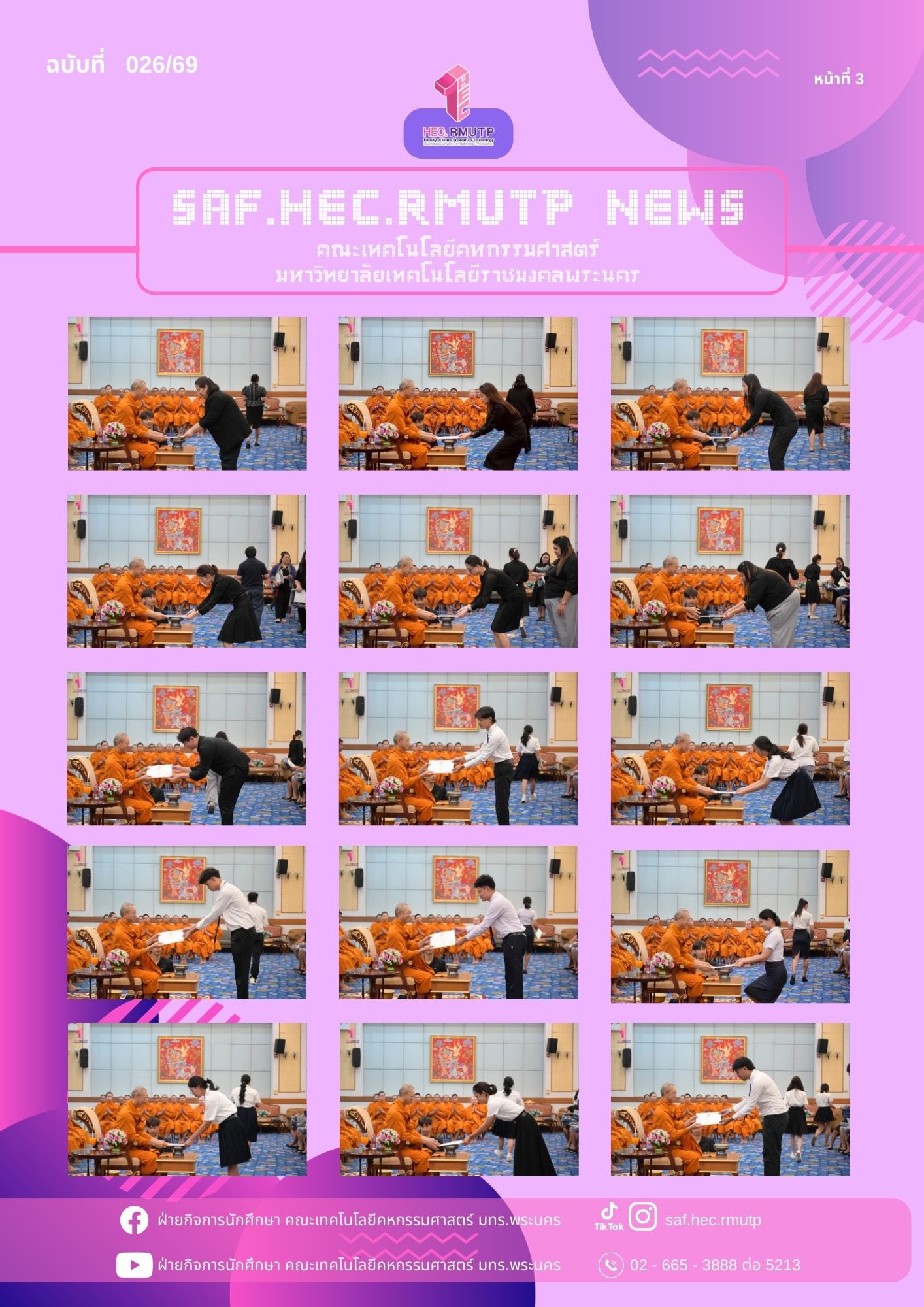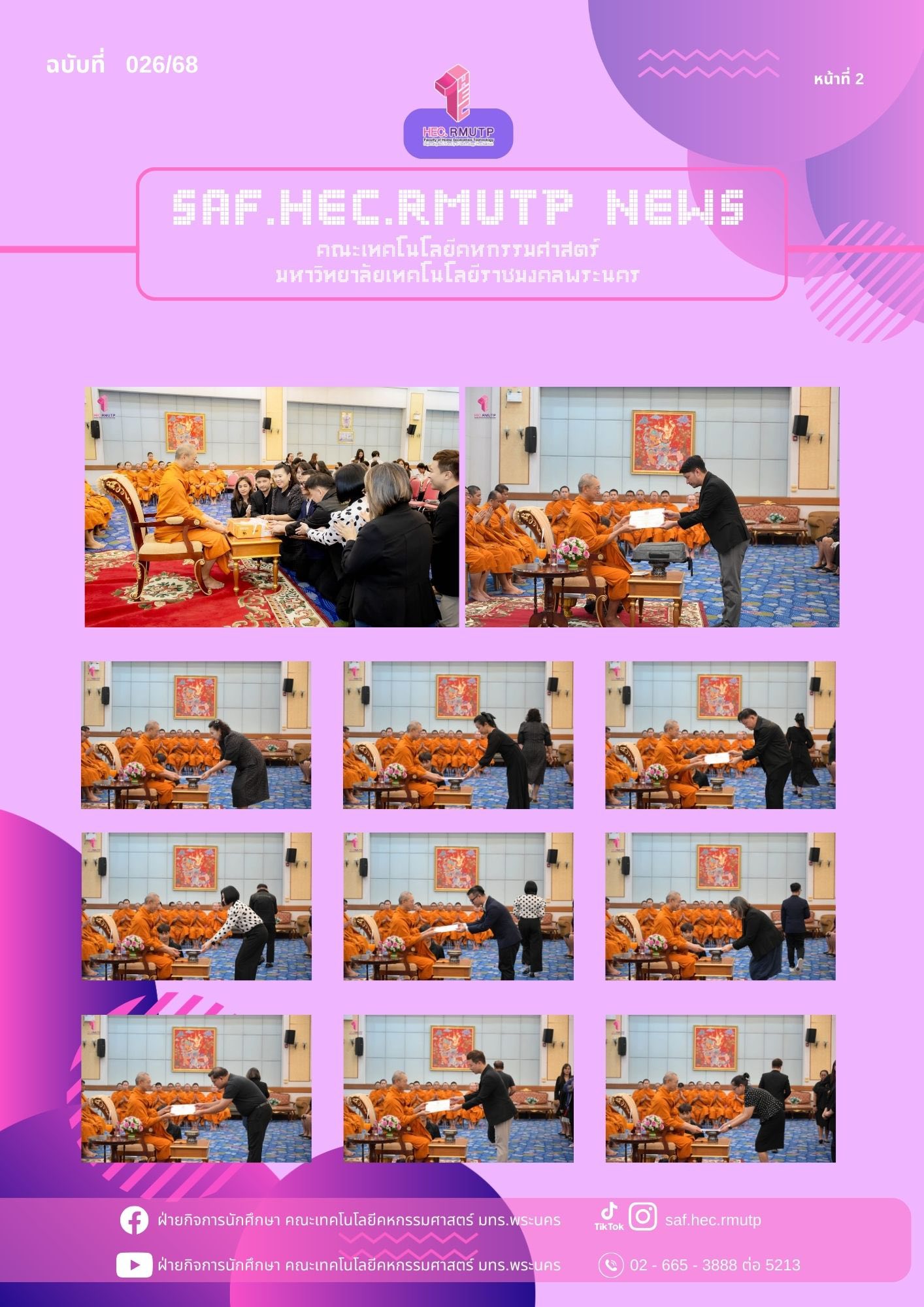 ร่วมประกอบพิธีมอบประกาศนียบัตรธรรมศึกษาชั้นตรี และมอบกระเป๋าที่ระลึกแก่ผู้บริหาร คณาจารย์ และนักศึกษาคณะเทคโนโลยีคหกรรมศาสตร์ มหาวิทยาลัยเทคโนโลยีราชมงคลพระนคร ภายใต้โครงการเรียนสอบธรรมศึกษา ประจำปีการศึกษา ๒๕๖๘