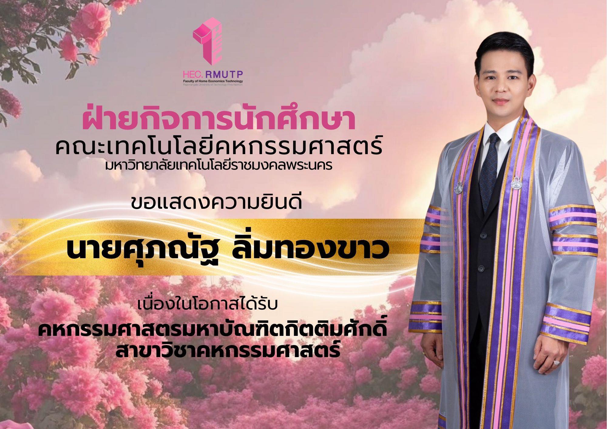 ขอแสดงความยินดีกับ นายศุภณัฐ ลิ่มทองขาว เนื่องในโอกาสได้รับคัดเลือกเป็น คหกรรมศาสตรมหาบัณฑิตกิตติมศักดิ์ สาขาวิชาคหกรรมศาสตร์