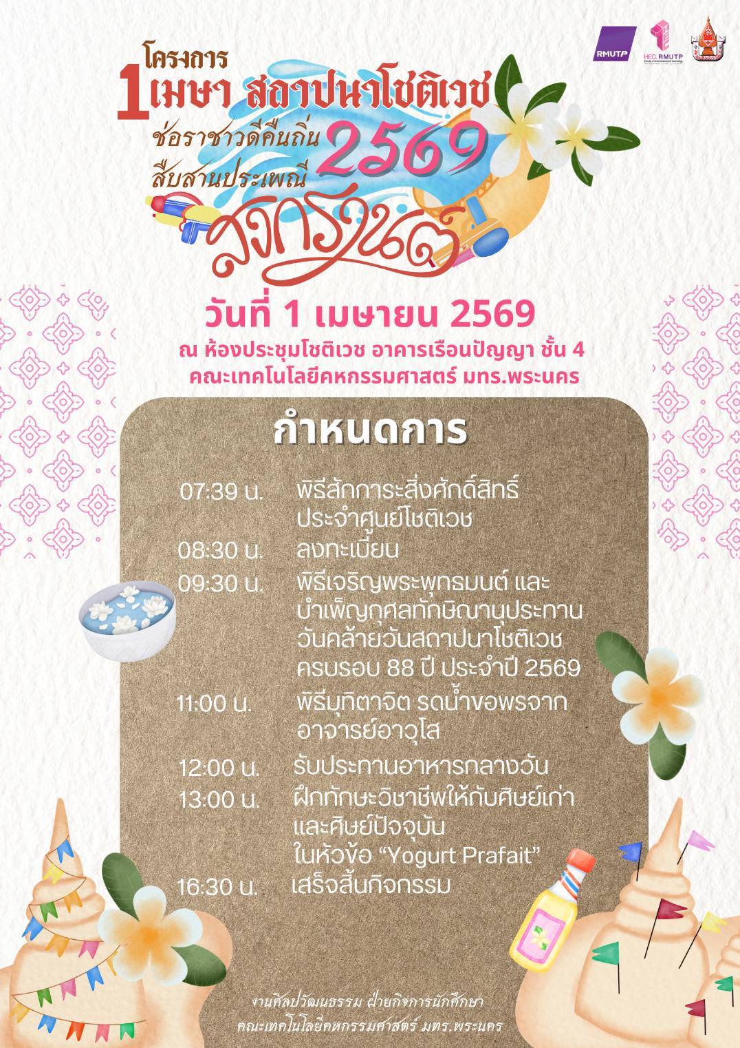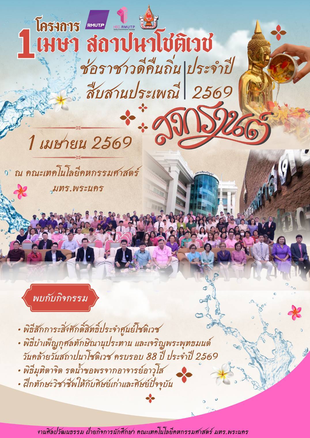 ขอเชิญคณะกรรมการบริหาร คณาจารย์ บุคลากร ศิษย์เก่า และศิษย์ปัจจุบันทุกท่าน เข้าร่วมกิจกรรมภายในงาน อาทิ พิธีเจริญพระพุทธมนต์ และฝึกทักษะวิชาชีพ พร้อมทั้งรับประทานอาหารกลางวันร่วมกัน ดังกำหนดการ