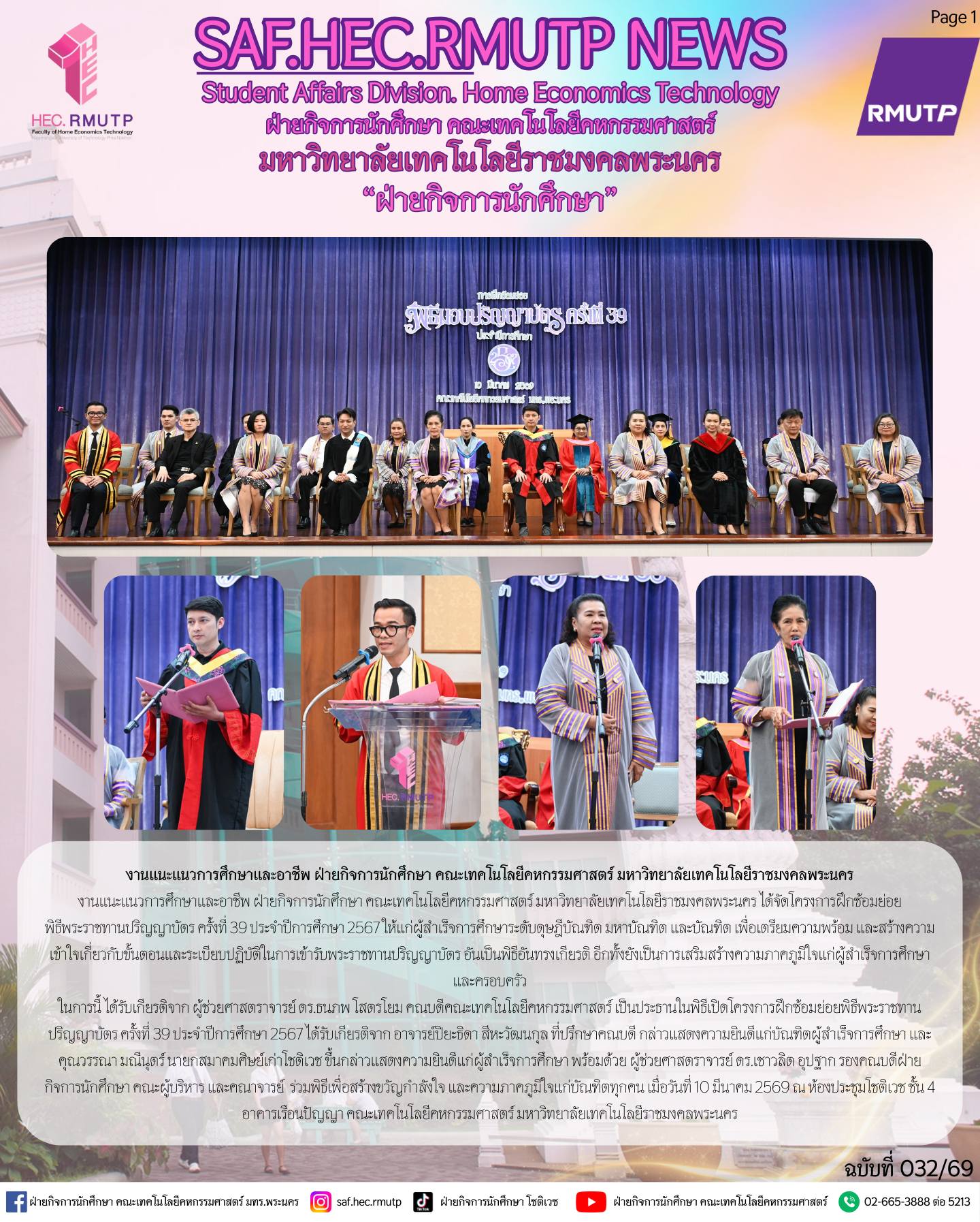 ในการนี้ ได้รับเกียรติจาก ผู้ช่วยศาสตราจารย์ ดร.ธนภพ โสตรโยม คณบดีคณะเทคโนโลยีคหกรรมศาสตร์ เป็นประธานในพิธีเปิดโครงการฝึกซ้อมย่อยพิธีพระราชทานปริญญาบัตร ครั้งที่ 39 ประจำปีการศึกษา 2567