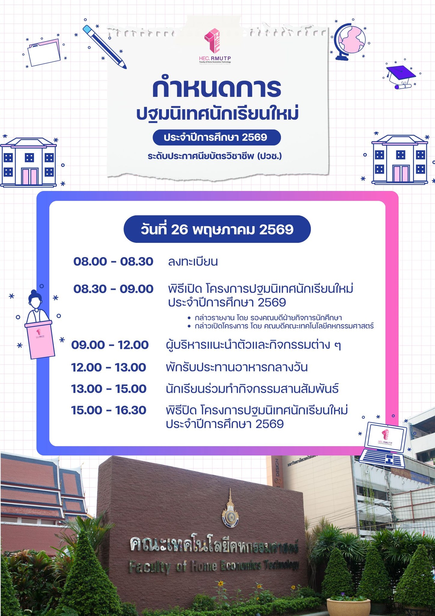 ขอเชิญชวนนักเรียนใหม่ ระดับประกาศนียบัตรวิชาชีพ (ปวช.) รหัส 69 เข้าร่วมโครงการปฐมนิเทศนักเรียนใหม่ ระดับประกาศนียบัตรวิชาชีพ (ปวช.) ประจำปีการศึกษา 2569 ในวันที่ 26 พฤษภาคม 2569 เพื่อเตรียมความพร้อมก่อนเริ่มต้นชีวิตในรั้วมหาวิทยาลัย สร้างแรงบันดาลใจในการเรียนรู้ พร้อมเรียนรู้ระเบียบวินัย และสิ่งแวดล้อมทางการศึกษา