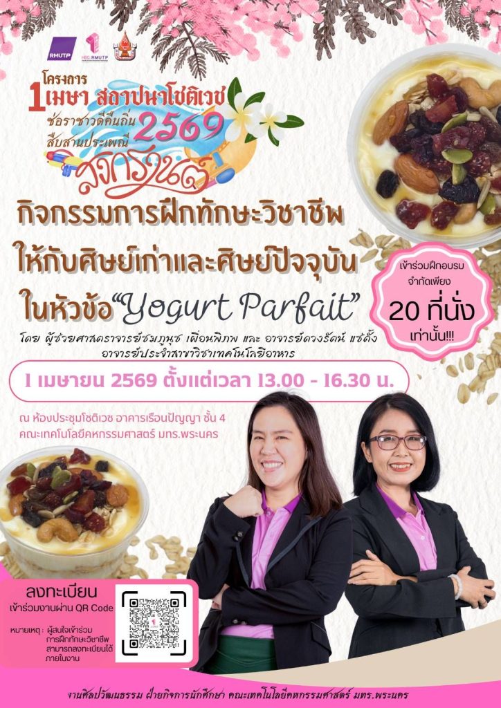 🎈พบกันในวันที่ 1 เมษายน 2569 ตั้งแต่เวลา 13:00 น. เป็นต้นไป ณ ห้องประชุมโชติเวช ชั้น 4 อาคารเรือนปัญญา คณะเทคโนโลยีคหกรรมศาสตร์ มหาวิทยาลัยเทคโนโลยีราชมงคลพระนคร