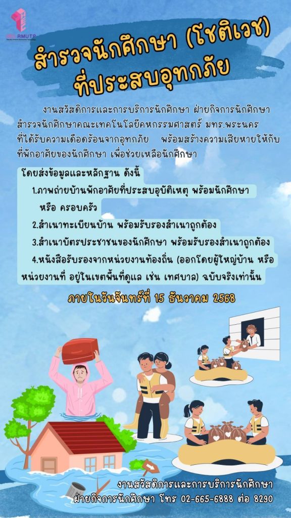 ขยายเวลาการสำรวจนักศึกษาที่ได้รับความเดือดร้อนจากอุทกภัย จนถึงวันจันทร์ที่ 15 ธันวาคม 2568