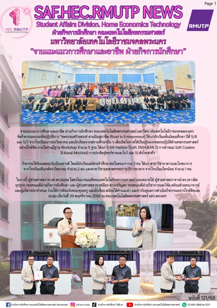 กิจกรรมอบรมเชิงปฏิบัติการ “คหกรรมสร้างสรรค์ สานฝันสู่อาชีพ (Road to Entrepreneur) ให้แก่นักเรียนชั้นมัธยมศึกษา ปีที่ 5/6 และ 5/7 จากโรงเรียนบางบ่อวิทยาคม และนักเรียนจากสถานศึกษาอื่น ๆ เพื่อเปิดโอกาสให้เรียนรู้และทดลองปฏิบัติด้านคหกรรมศาสตร์อย่างใกล้ชิด