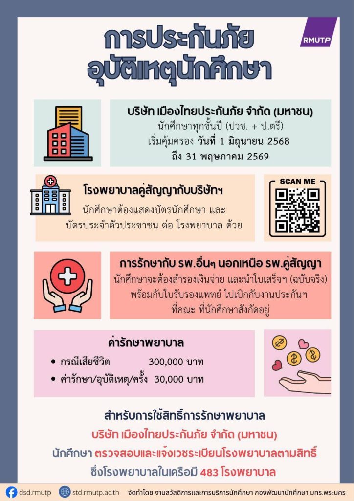 บริษัท เมืองไทยประกันภัย สามารถเคลมได้โดยไม่ต้องสำรองจ่าย เพียงยื่นบัตรประชาชน และ แจ้งว่า ขอใช้สิทธิ์ ประกันอุบัตอุบัติเหตุ มทร.พระนคร
