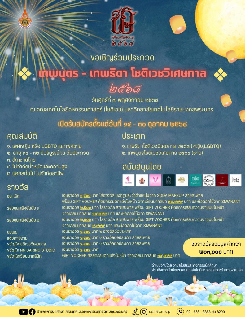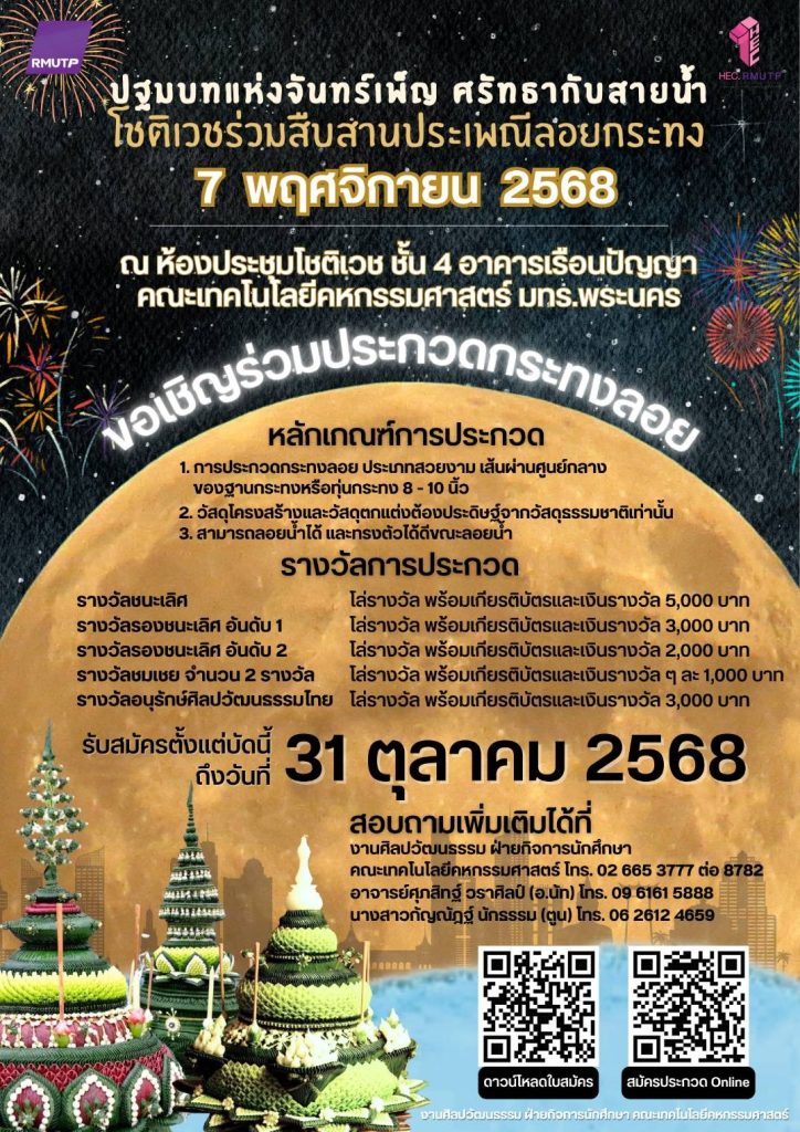 คณะเทคโนโลยีคหกรรมศาสร์ ขอเชิญชวนเข้าร่วมการประกวดกระทงลอย สืบสานเทศกาลประเพณีลอยกระทงในกิจกรรม ‘ปฐมบทแห่งจันทร์เพ็ญ ศรัทธากับสายน้ำ โชติเวชร่วมสืบสานประเพณีลอยกระทง ประจำปีการศึกษา 2568’
